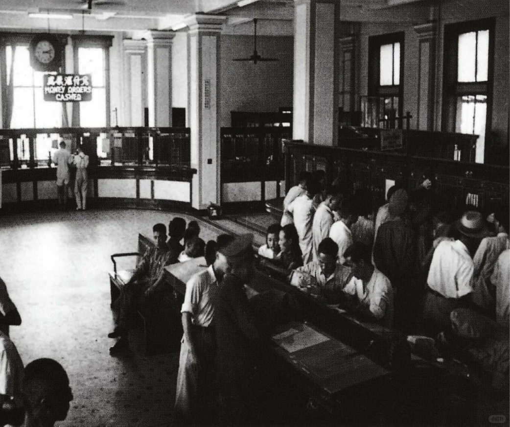 民国时期,中国逐步独立地办理邮件及电信传递业务,但都比较落后,图为当时的邮政局门厅