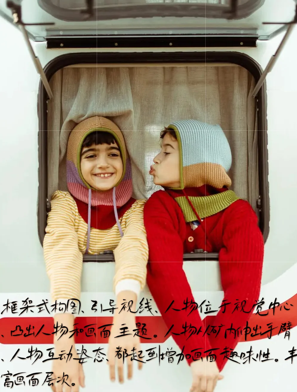 [一R]构图:框架式构图,引导视线,人物位于视觉中心,凸出人物和画面主题。人物从矿内伸出手臂,人物互动姿态,都起到增加画面趣味性。丰富画面层次。