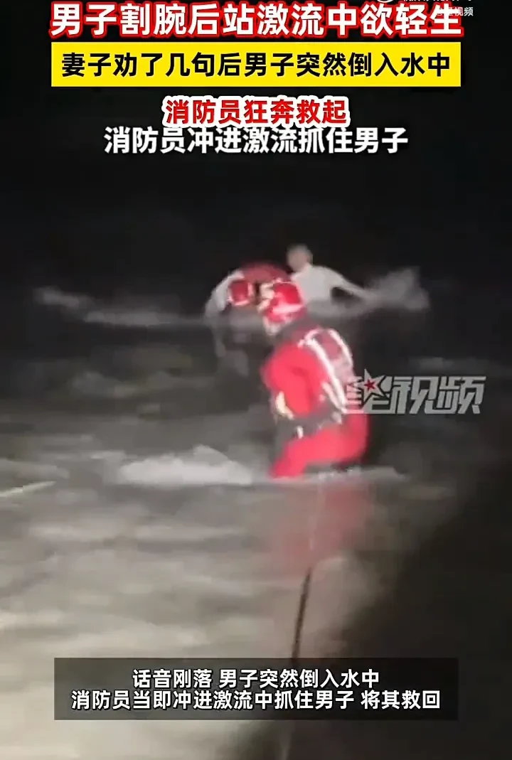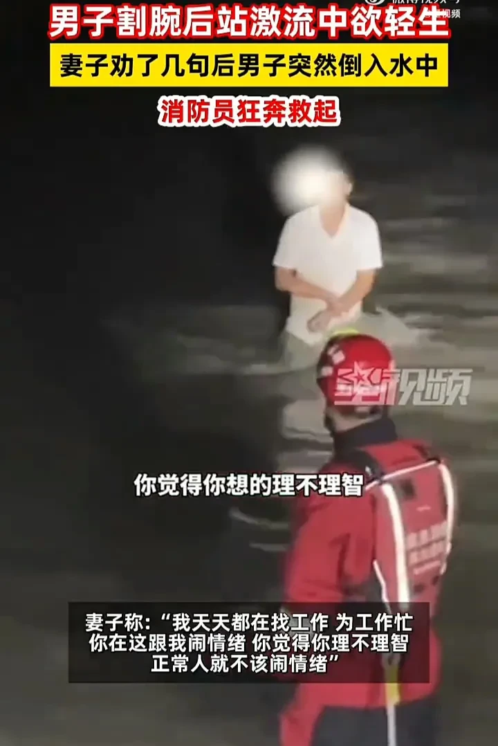 太悲哀了!近日,四川成都一名男子割腕后站在激流中想轻生,妻子到场后,不仅没能安慰男子,反而说道:“我天天都在找工作,你在这跟我闹情绪,你觉得你理不理智,正常人就不该闹情绪!”听完,男子转头倒入水中,所幸消防员及时抓住男子,才将他救回。