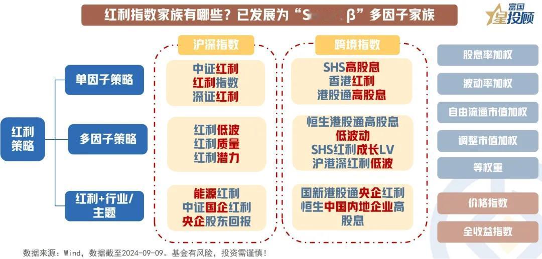 #基金投顾# 【星图说】11幅图,玩转红利指数投资!(三) 红利指数家族有哪些?已发展为“Smart β”多因子家族 红利策略(dividend strategy)的核心是以红利因子筛选股票池,精选投资标的,是一种典型的“Smart beta”投资策略。红利指数基金选定跟踪指数后,全部或部分买入指数成份股,力求跟踪复制或超越(指数增强)指数表现。 按策略构建方式,红利策略可分为“单因子策略”、“多因子策略”、“红利+行业/主题策略”。其中,单因子策略仅根据股息率编制指数;多因子策略在红利因子基础上选取了低波、质量等因子以提高指数质量与可投资性。此外,红利+行业/主题策略则在红利因子之外增加行业主题标准,如央企红利、国企红利指数等。 (市场有风险,投资需谨慎)