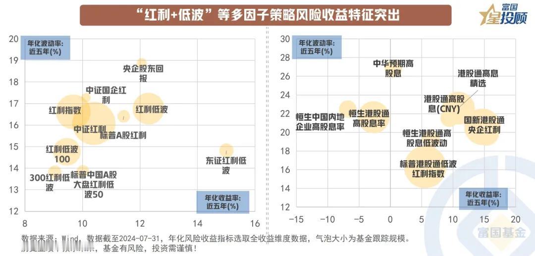 #基金投顾# 【星图说】11幅图,玩转红利指数投资!(七) “红利+低波”等多因子策略风险收益特征突出 A股红利指数中,各红利指数风险与收益基本正向匹配,红利低波、东证红利低波、标普A股红利指数风险收益性价比较高,在当前市场环境下,红利因子与低波因子的组合能在有效降低组合波动同时创造较好投资回报。 港股红利指数中,国新港股通央企红利、标普港股通低波红利、恒生港股通高股息低波动指数风险收益性价比较高,低波因子再次验证其有效性。近年来长端利率持续下行,资金更偏好配置安全性较高、波动率较低资产,这为“红利+低波”因子组合的优秀表现创造了基础。 (市场有风险,投资需谨慎)