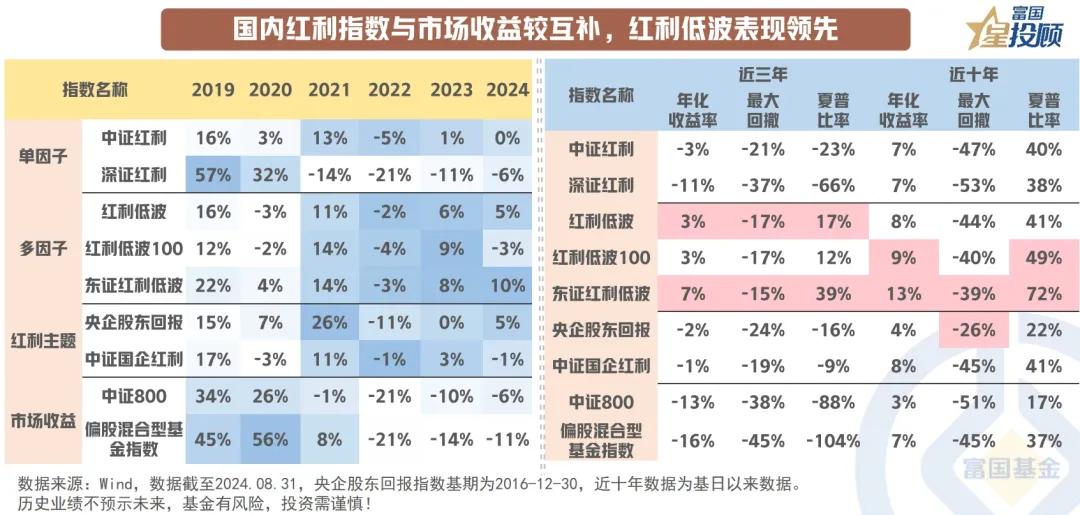 #基金投顾# 【星图说】11幅图,玩转红利指数投资!(八) 国内红利指数与市场收益较互补,红利低波表现领先。A股红利指数风险收益呈现两大特征:其一,红利指数收益与市场收益呈现较高互补性,红利策略在市场熊市表现出优秀的防御属性,而在市场牛市阶段跑输市场指数;其二,“红利+低波”多因子收益有效性显著,三大红利低波指数年度平均收益与中长期风险收益性价比均优于红利单因子指数。红利资产本身具备一定短久期与低波动特征,红利低波系列指数在此基础上设定股息率与波动率标准,有助于降低组合回撤,在当前市场环境下,红利低波资产更具备“类债”特征,在市场利率持续走低情况下,较具投资性价比。 (市场有风险,投资需谨慎)