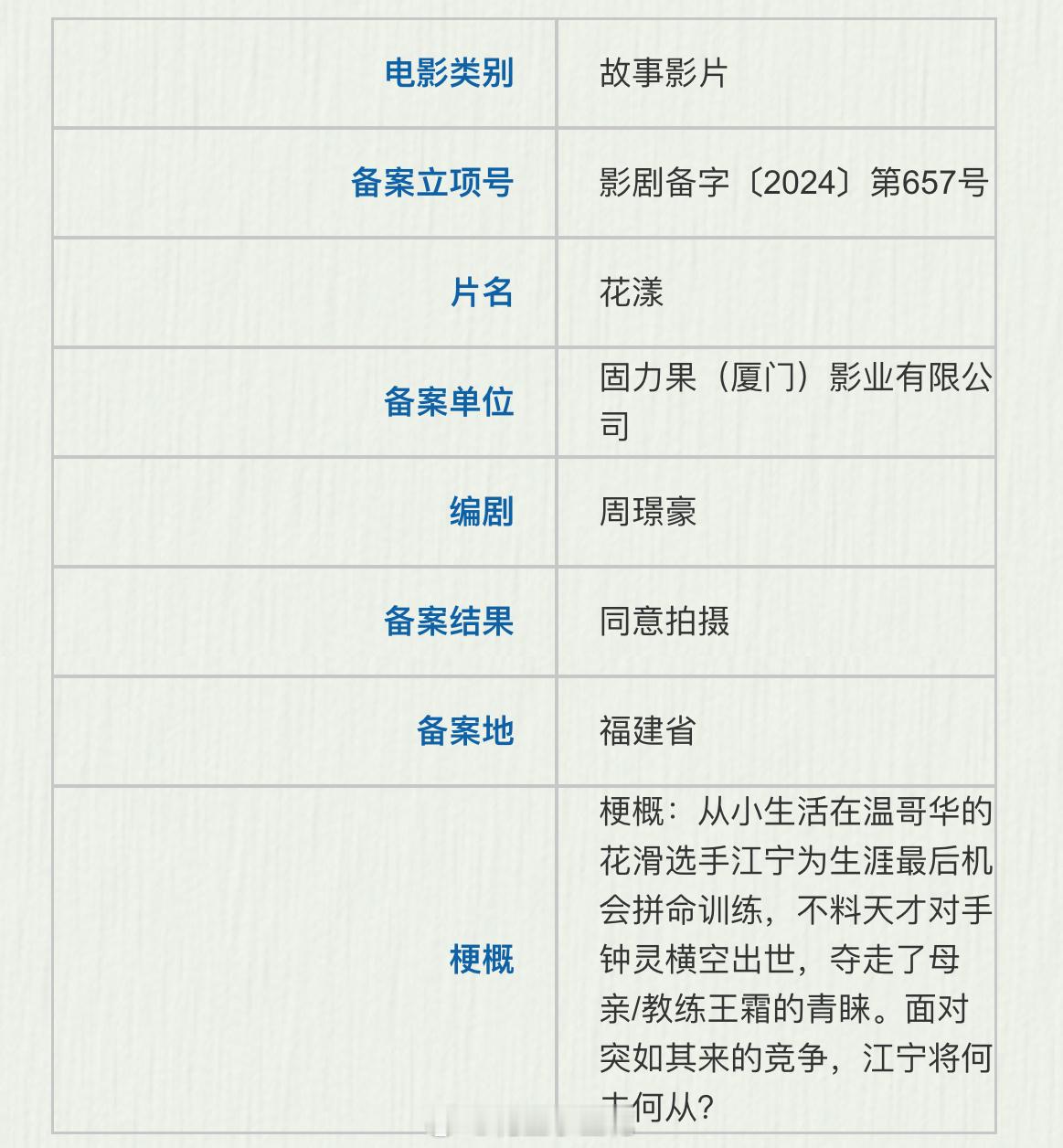 梗概:从小生活在温哥华的花滑选手江宁为生涯最后机会拼命训练,不料天才对手钟灵横空出世,夺走了母亲/教练王霜的青睐。面对突如其来的竞争,江宁将何去何从?