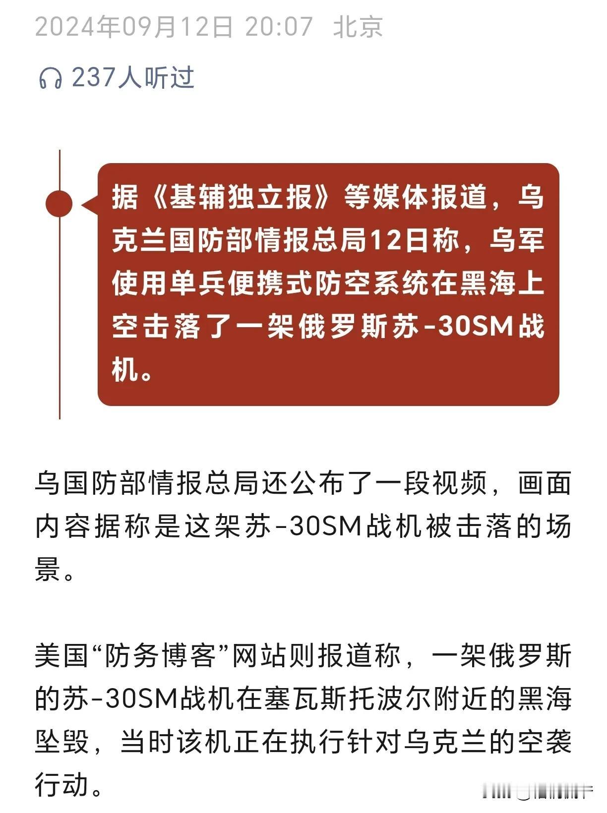 根据乌克兰媒体的报道,乌军近日使用单兵便携式防空系统,在黑海上空击落了一架俄罗斯的苏-30SM战机,这也得到来自美国和俄罗斯多个消息渠道的确认。 苏-30SM战斗机被认为是目前俄罗斯最先进的战斗机,造价数十亿美元,2012年才开始列装俄罗斯空天军部队,是当前俄军的主力战机。 不得不说,俄罗斯在这两年多以来的表现,实在是不如人意,不仅黑海舰队损失多艘战舰,空军也损失了多架飞机,大量坦克和装甲车被摧毁。要是照这么打下去,俄罗斯的家底迟早会被掏空的。 反观乌克兰方面,在美国和其他西方国家的援助下,获得了大量先进武器,虽然其使用受到很大的限制,但仍然获得了可观的战绩。 这次俄军的苏-30SM战斗机被乌军击落,对俄空军士气会产生很大影响,很显然,这一局俄罗斯又吃瘪了。