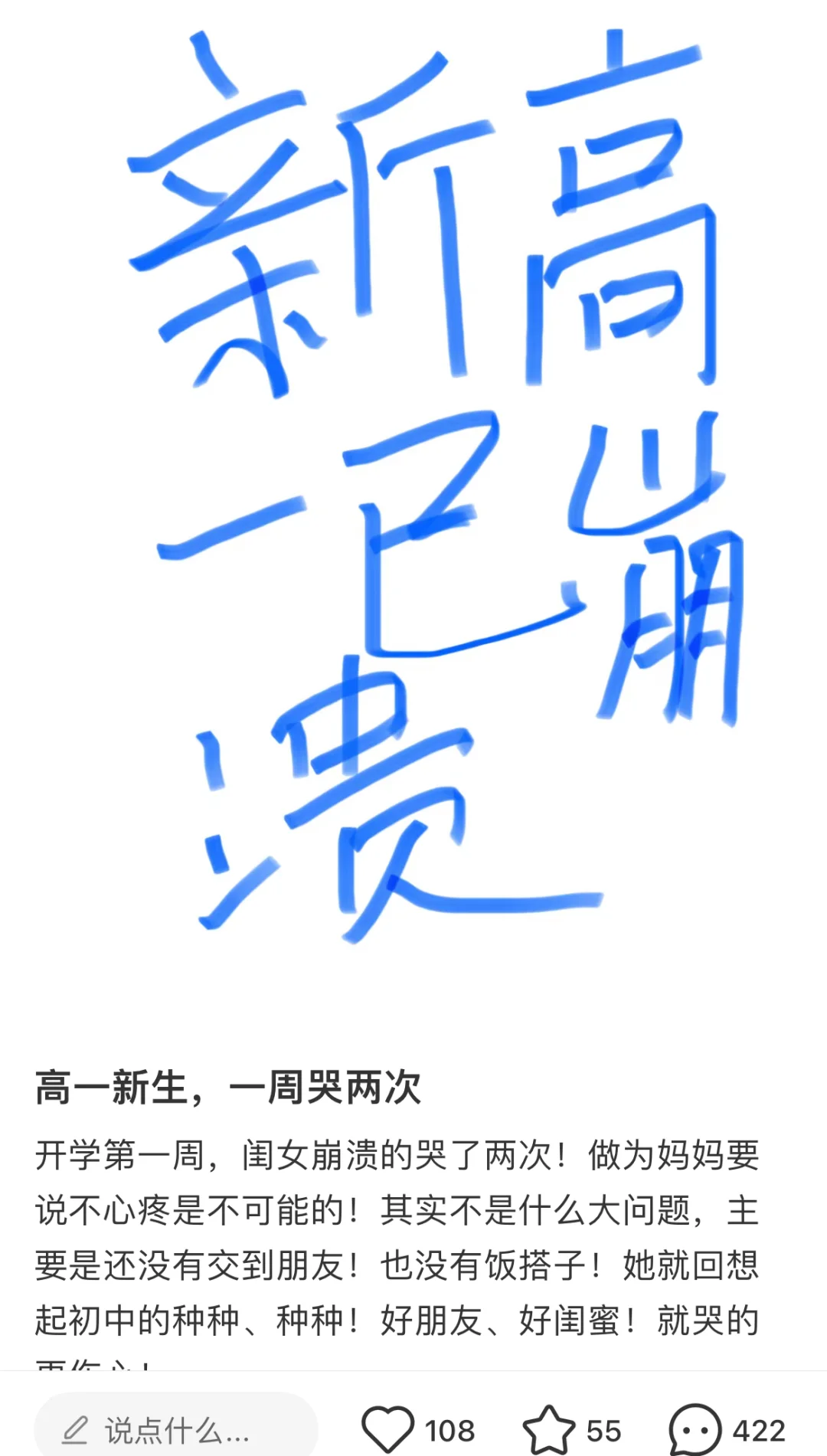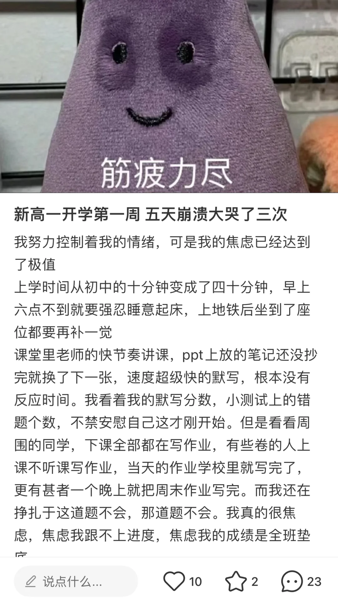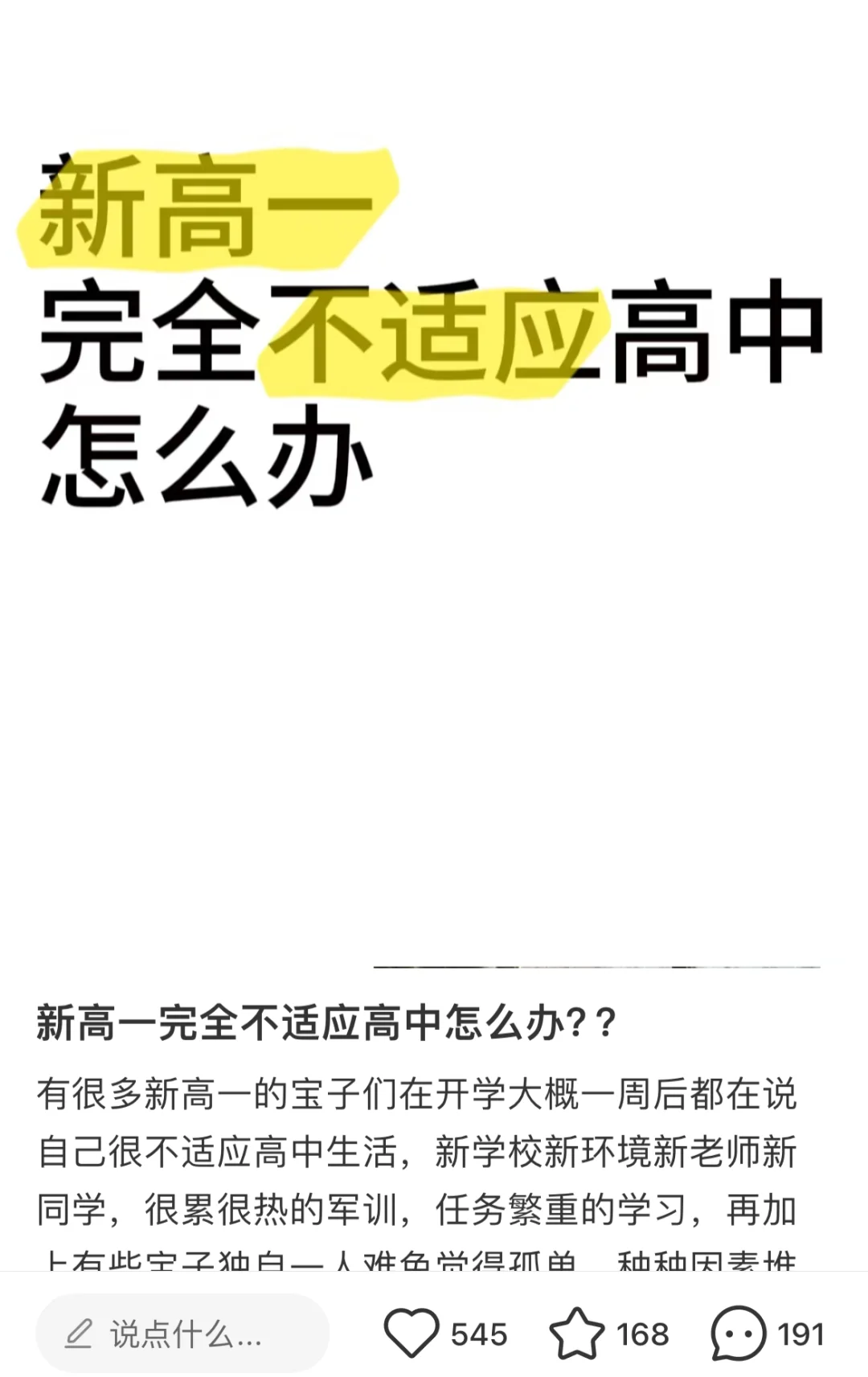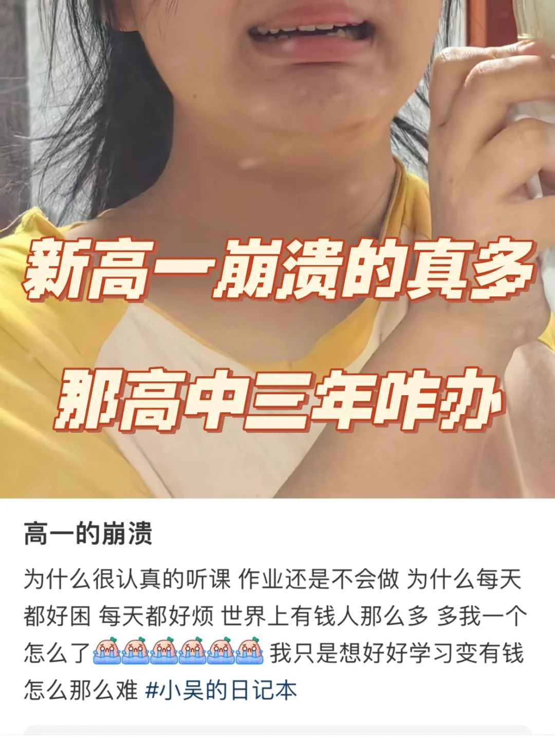 看看我在上刷到的新高一孩子们的崩溃呐喊!多少孩子到了新高一不适应。陌生的环境,紧张的节奏,大量的作业,匮乏的睡眠,紧绷的神经,天啊,这才刚开始,很难想象她们怎么坚持到高考。[哭惹R]