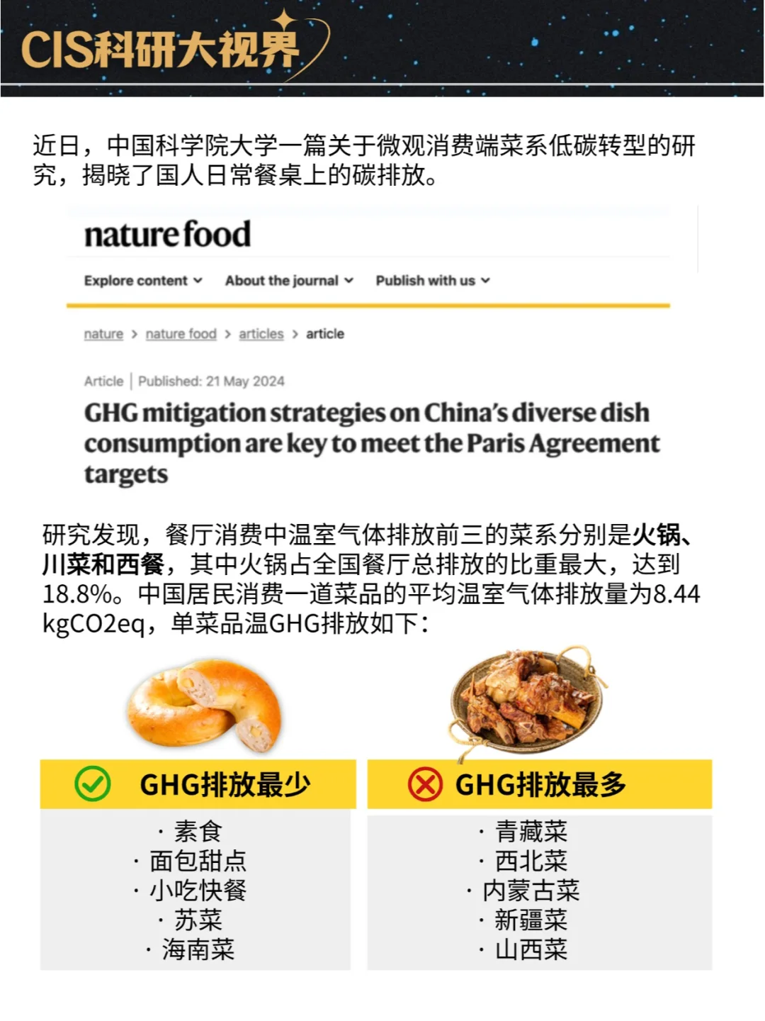 近日,中国科学院大学一篇发表于Nature子刊Nature Food关于微观消费端菜系低碳转型的研究,揭晓了国人日常餐桌上的碳排放。
