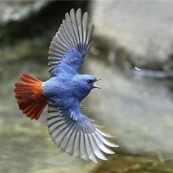 🍀生活习性:红尾水鸲常单独或成对活动。多站立在水边或水中石头上、公路旁岩壁上或电线上,有时也落在村边房顶上,停立时尾常不断地上下摆动,间或还将尾散成扇状,并左右来回摆动。当发现水面或地上有虫子时,则急速飞去捕猎,取食后又飞回原处。有时也在地上快速奔跑啄食昆虫。当有人干扰时,则紧贴水面沿河飞行。