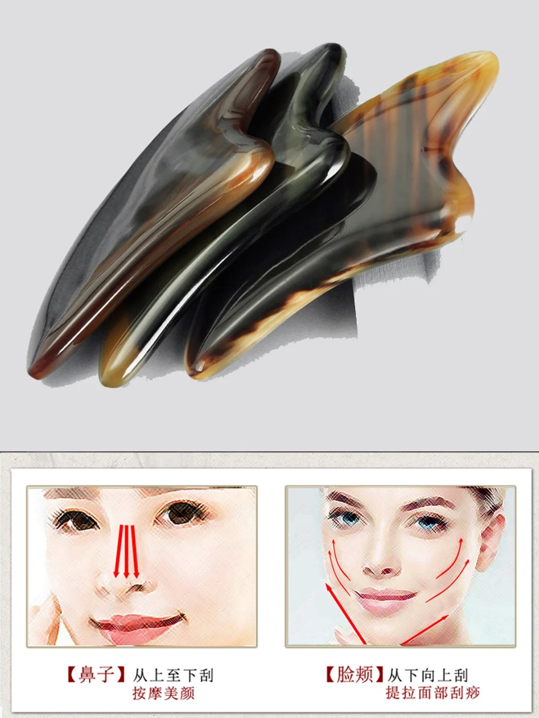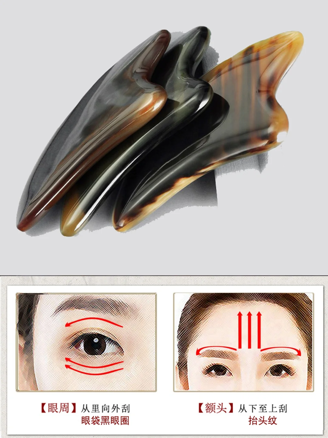 为什么选牛角刮痧板: ✅圆润边角——不伤肤 ✅厚实饱满——手感好 ✅细腻纹理——天然美 - 不同部位厚度推 荐,熟练使用的,都可以用。 ⭐身体部分:0.4-1.0cm厚度的都可以。 ⭐脸部使用:要厚实一些的,0.7-1.0cm厚度,不需要太厚,效果更佳 ⭐眼部使用:就要接触面小一些的,可以刮痧板拨筋一起使用。 - ⚠️清楚自己的需求: 用刮痧板目的是什么?按摩、缓解肌肤疲劳、初老、斑、痘、刮痧去毒、富贵包,推地筋,根据不同的类别需求,选择刮痧板的接触面积和厚度都不一样。 - ⚠️注意事项: ①皮肤有伤口、炎症等的不使用刮痧板 ②刮痧板工具完好 ③使用刮痧板时力道轻柔,手法和方向要正确 ④皮肤上均匀涂抹润滑油 ⑤刮痧板大头、小头,大头按摩面部的淋巴,提升紧致面部轮廓,小头点压穴位,放松肌肤。 ⑥抬头纹、法令纹处,把纹路撑平,再进行刮,淡化纹路。 ⑦涂抹护肤营养液,有利于吸收。 ⑧一周进行2-3次。 - 天然牛角材质,每个都不一样
