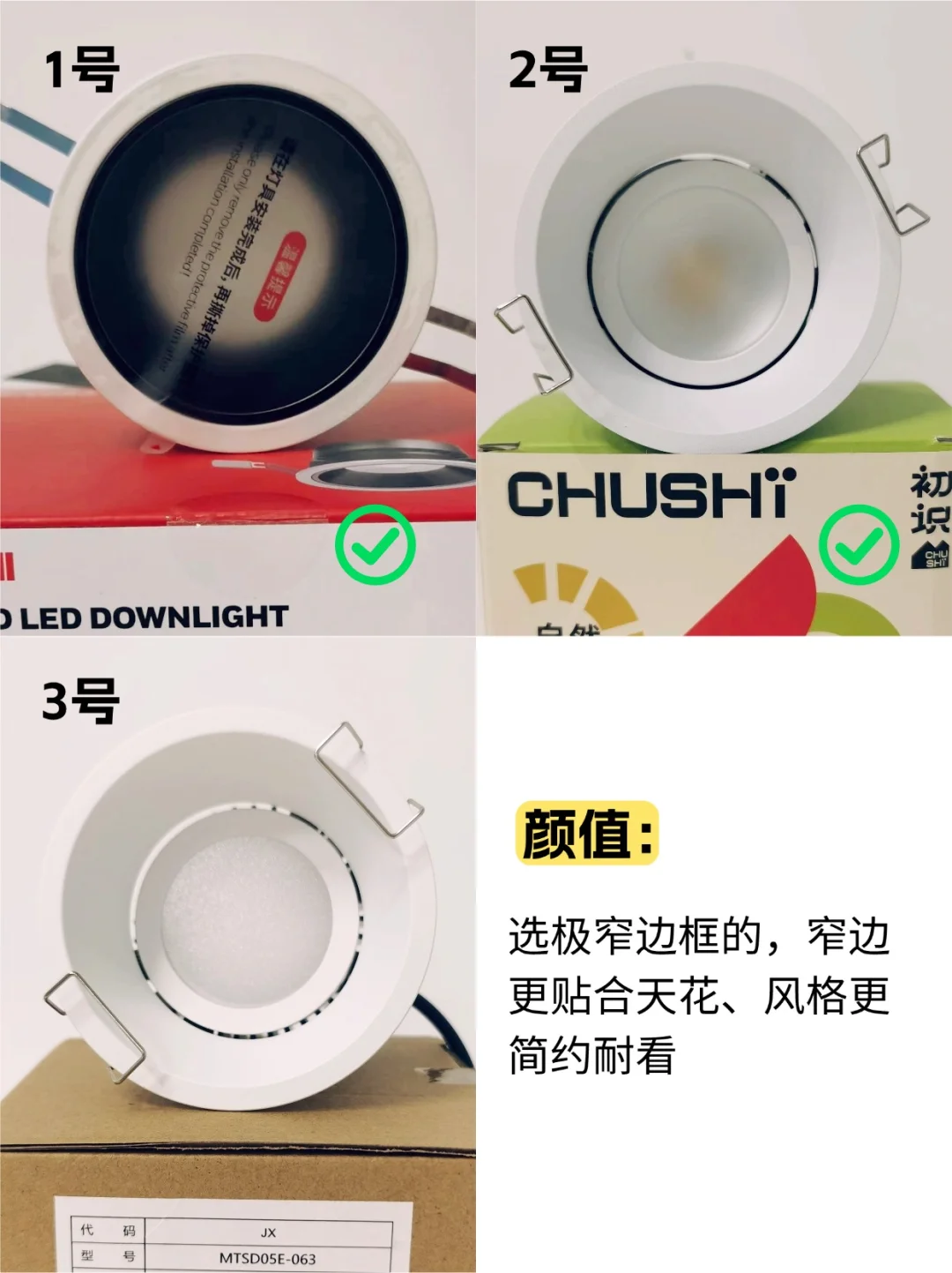 极窄边框更贴合天花、简约耐看,当然,对于颜控来说款式设计也是吸引我的一点~可以看到1号和2号的边框都是比较窄的,是我的首选~