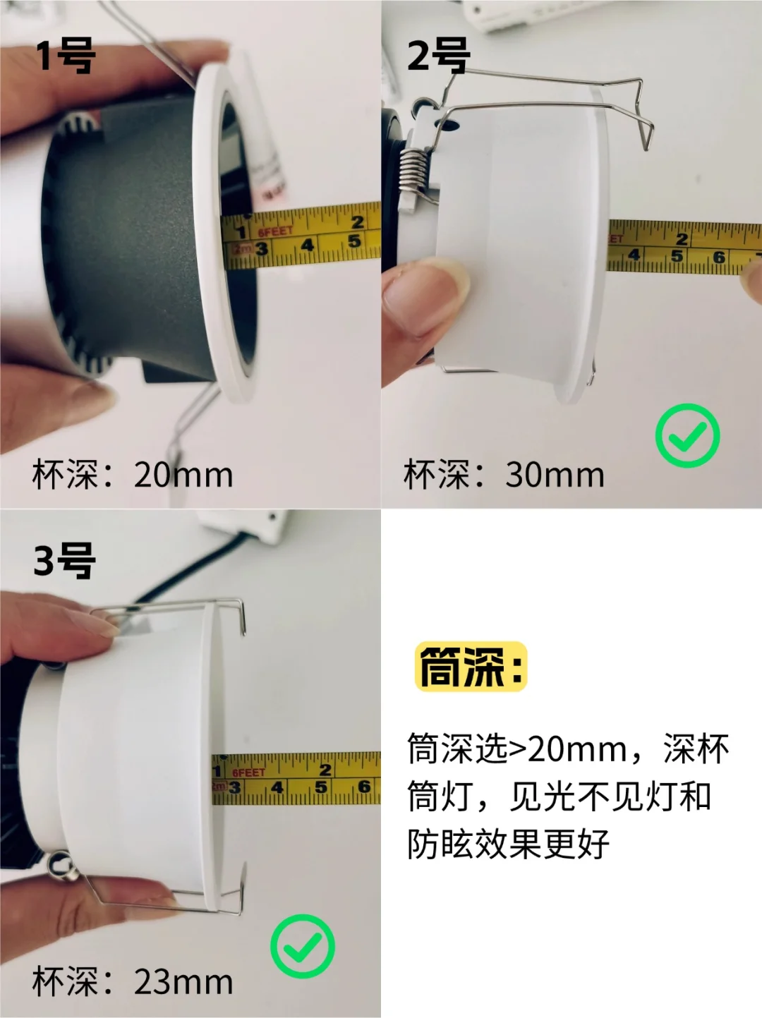 选筒深>20mm的,我家原来的筒灯是平杯,光源集中且外漏,这种刺眼但凡余光扫到都让人不适!深杯的作用是把光源隐藏起来,避免直视光源。实测下来2号的杯深较深! 出光更柔和均匀有氛围感