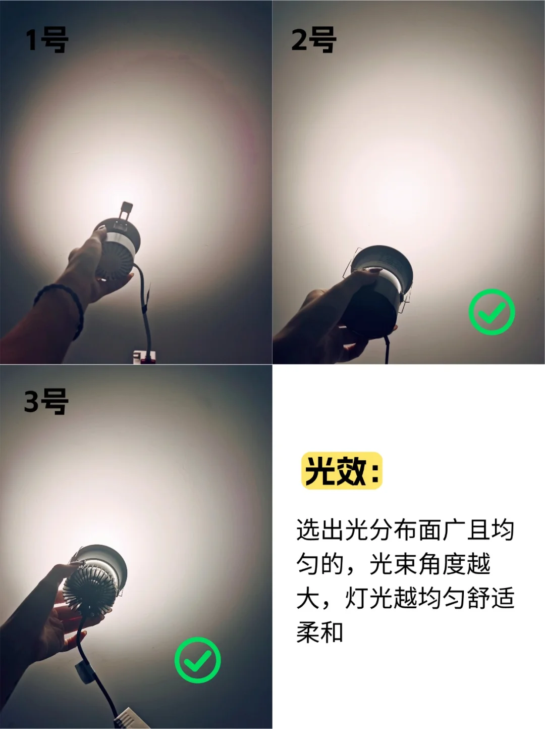 如果是用来基础照明的,就要看呈现出来的光束是否均匀无杂光!光束角度越大,灯光越均匀舒适柔和&这次测下来我觉得2号的柔光效果是我最满意的~