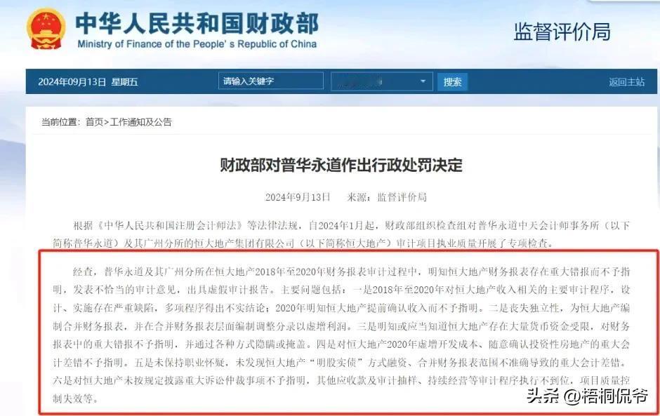 哈喽,晚上好!我是梧桐侃爷!接下来跟大家一起聊聊两个与恒大地产相关的消息: 1、近日,根据公开消息,普华永道会计师事务所及广州分所负责的恒大地区审计项目,合计被处以3.25亿元的顶格处罚,据悉普华永道大量人员流失,业务已经难以为继; 2、根据外媒报道,许家印近日被转移到了深圳,并被安置在了某特殊场所,据说是为了方便其与恒大集团高管们的沟通,许家印还给高管们写了一封信,劝说他们要全力配合调查。 对于普华永道被处罚,我是拍手称快的,这家事务所为了赚钱,不惜违背商业道德,伙同恒大地产弄虚作假,制造恒大地产虚假繁荣的景象,让无数购房者倾家荡产,如此恶劣的行为,必须重重地处罚,并且永远不许涉足内地审计业务。 而有关许家印的情况,则再次说明之前他已经病亡的传闻不攻自破,接下来围绕恒大地产还有很多未解之谜,需要剥丝抽茧,还原事实真相,不过等待他的将是应有的严厉惩罚。