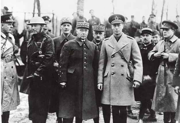 图2:1939年,英国国王乔治六世(右三)在法军总司令甘末林(左四)的陪同下视察法国前线。战前英法高调对波兰做出安全保证,一方面指望德国会知难而退,另一方面担心如果波兰得不到支持可能会不战而屈服,但等战争爆发后,英法联军却坐视波兰亡国