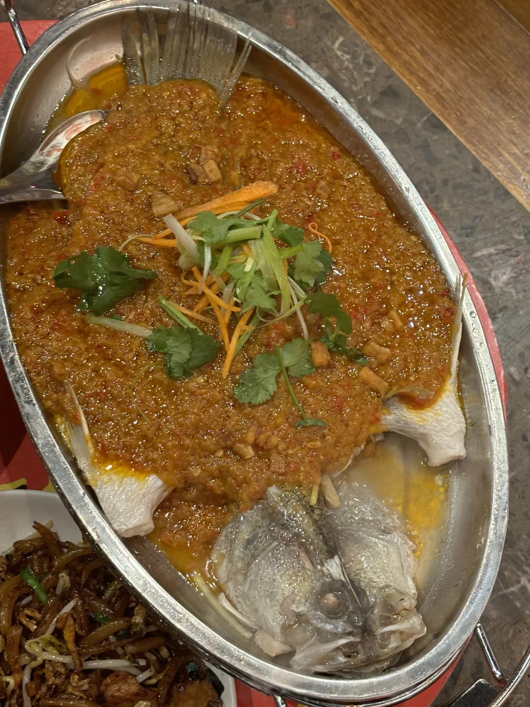 马来西亚的一种清蒸鱼,丰富的香料和调味料增加了一条普通清蒸鱼的口味,咸咸辣辣的具有东南亚风味