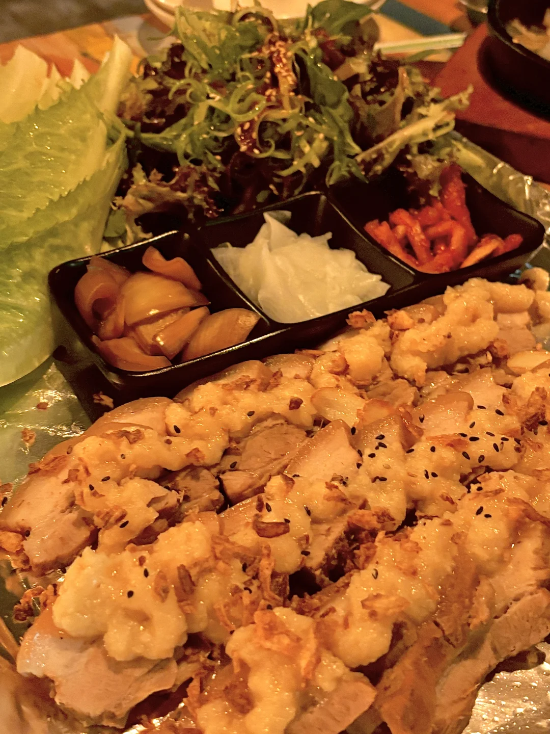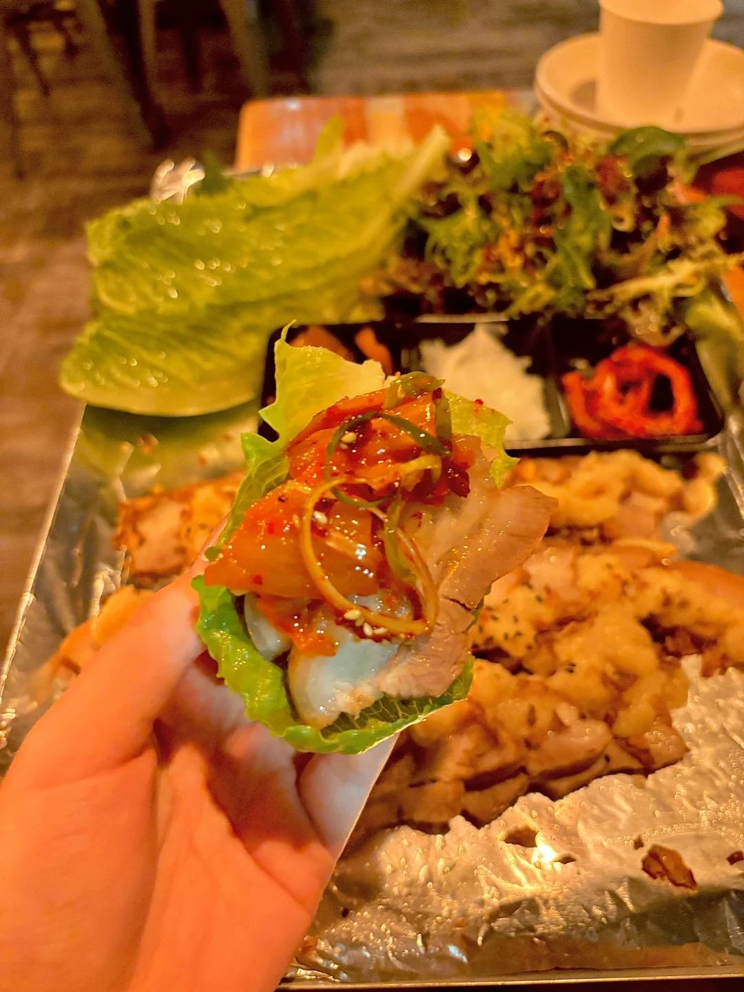 我个人最爱吃的还是韩式五花肉,特别是蒜香口味的。配菜有紫苏叶和白菜,用白菜卷着五花肉和辣白菜一起吃,味道绝佳,巨好吃肥而不腻[喝奶茶R]