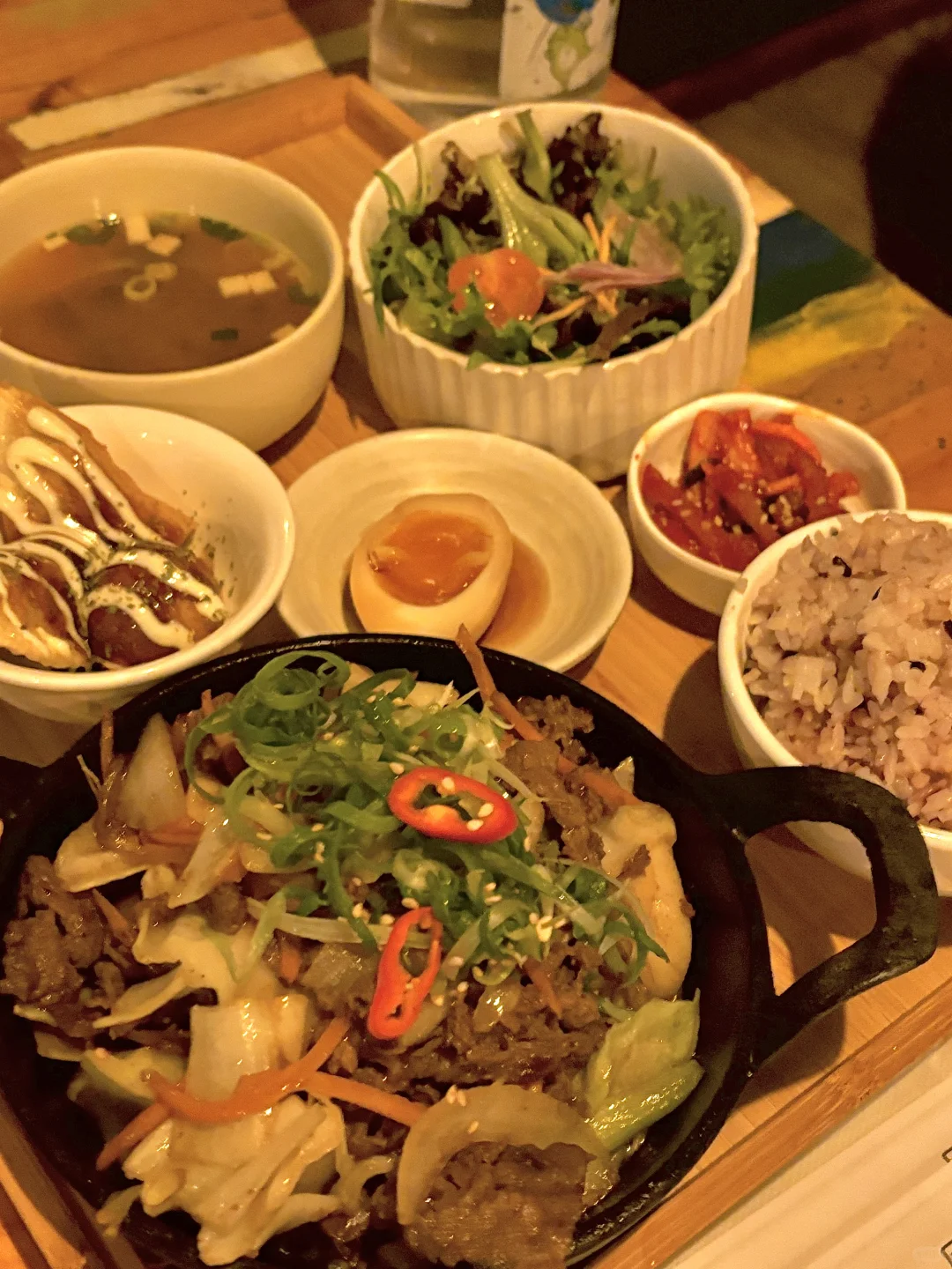 我们点了店里的Lunch Special——Beef Bulgogi套餐,这份套餐不仅包含了美味的牛肉,还有新鲜的蔬菜沙拉、紫米饭、酱鸡蛋和章鱼小丸子,真的是很值,性价比这一块真的拿捏得死死的。而且虽说lunch special,但晚餐也可以点哦[色色R]