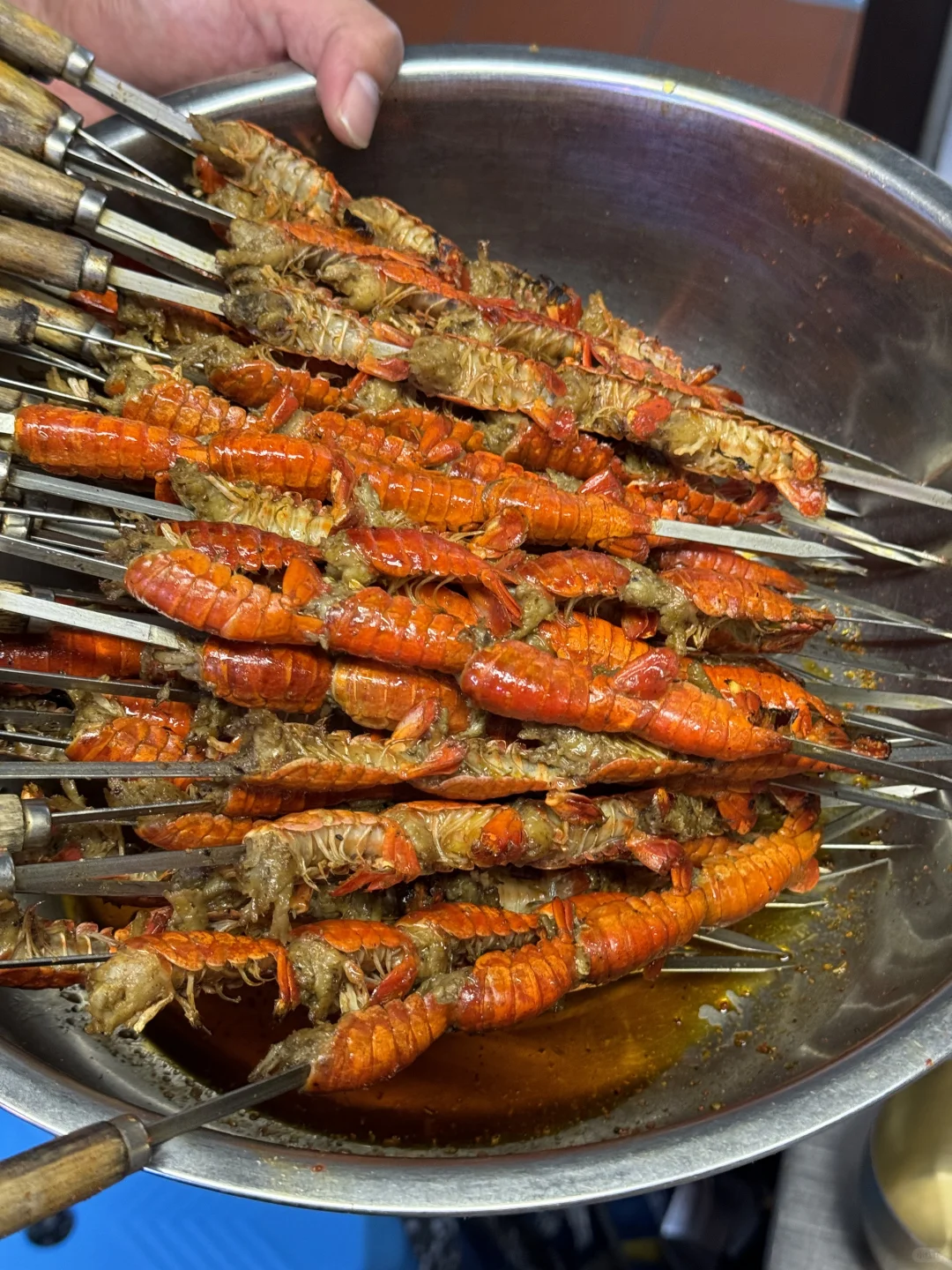 还没到饭点一楼就坐满了 它家烧烤真的香!!好多我没吃过的种类🤤 除了肉筋 还有🔥烤海肠、烤虾尾、烤鸭舌… -