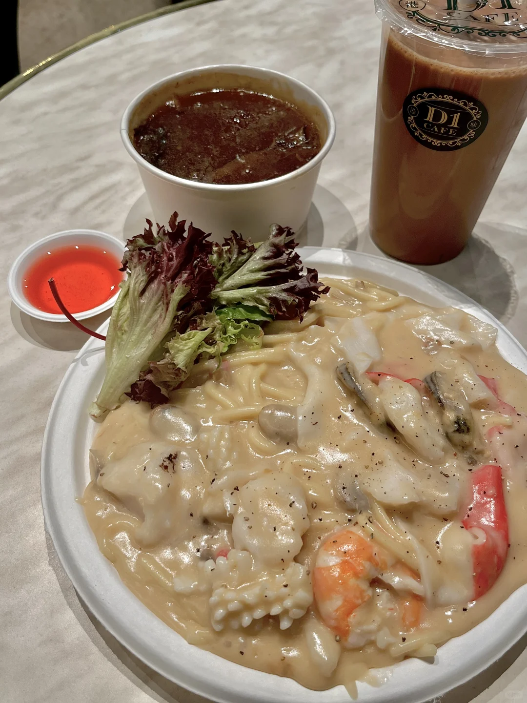 白汁海鲜焗饭:酱汁浓郁,吃多了也不会感到腻,酱里面包括虾仁🍤、鱿鱼🦑和鱼🐟,分量非常足,吃一份就撑了!