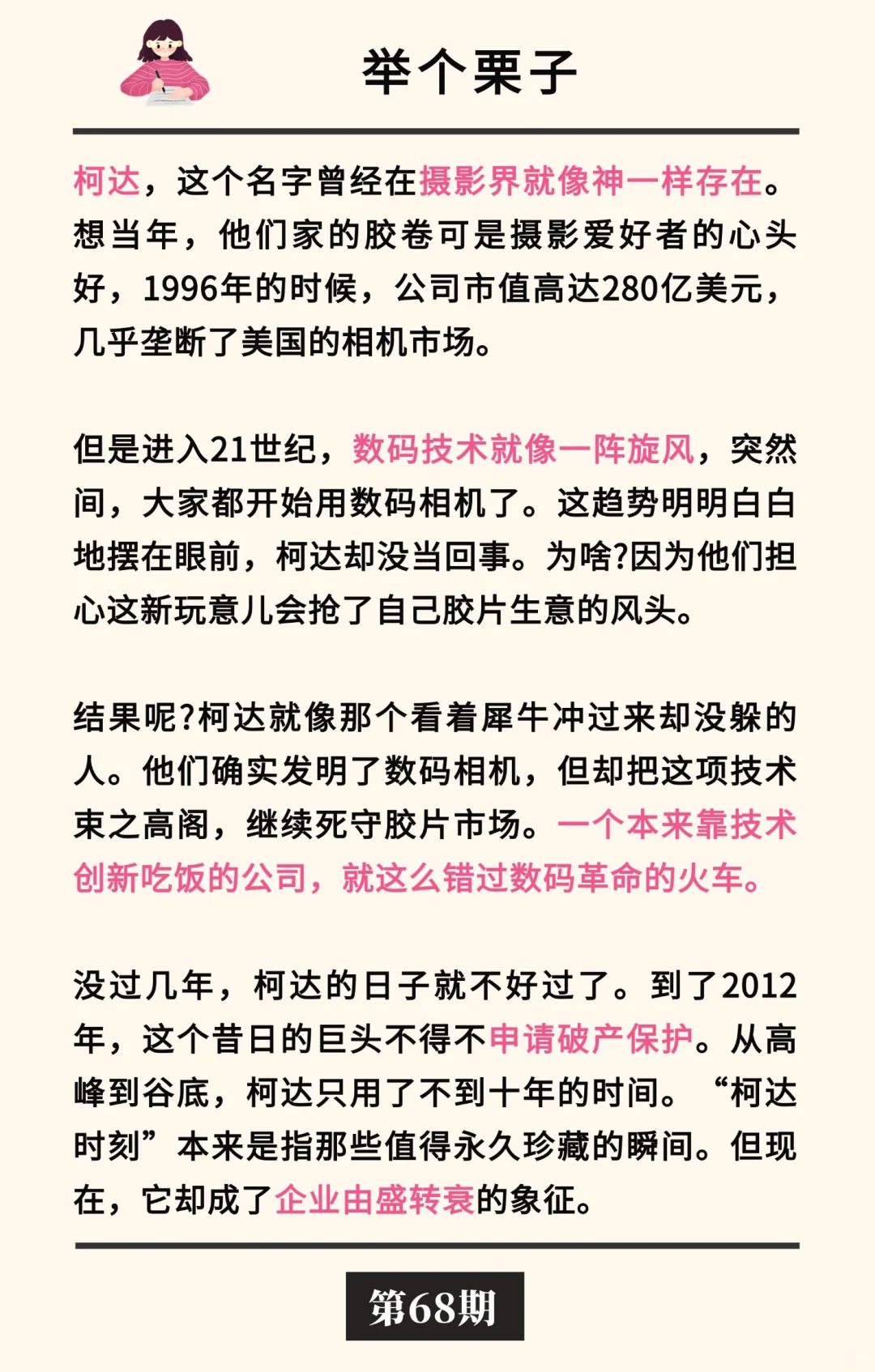 柯达那个,我记得好像是他们预见数码相机会被淘汰,但是没想到会比他们预计的晚