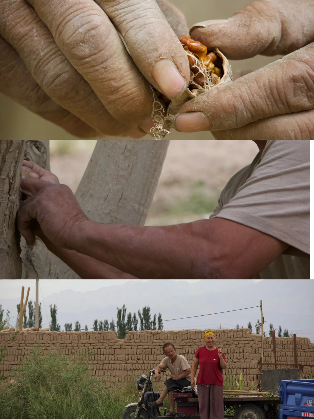 过了吐鲁番的时候 我们看到路边很多葡萄架 就停下来拍照 ,路边一对很热情的夫妇就给我们送了一串葡萄 ,葡萄真心好吃,还给我敲新鲜的核桃吃,可是我们语言不通 ,他一直重复自己四十亩葡萄三十亩核桃,我本以为他是要卖我们葡萄 可是他又没有,还是想网上销售?可是他又没留信息 我们急着赶到终点 我留了🐧 但也没加我;