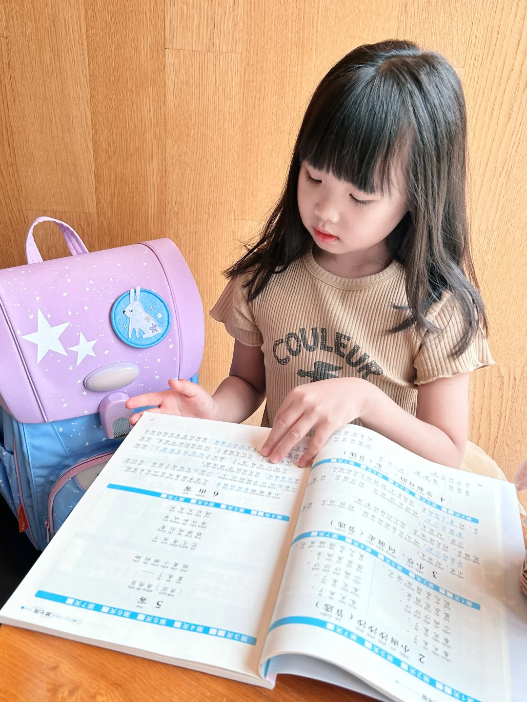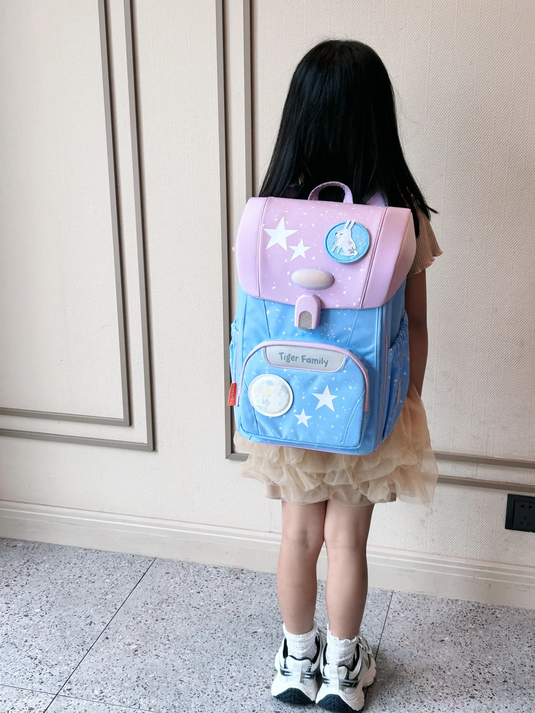 末姐依旧背的是Tiger Family的护脊书包,外关没话说,小女生背着好看的书包,上学都更大积极性,书包上印着星空的图案,马卡龙的色系符合末姐的审美,我也觉得很好看哈哈~