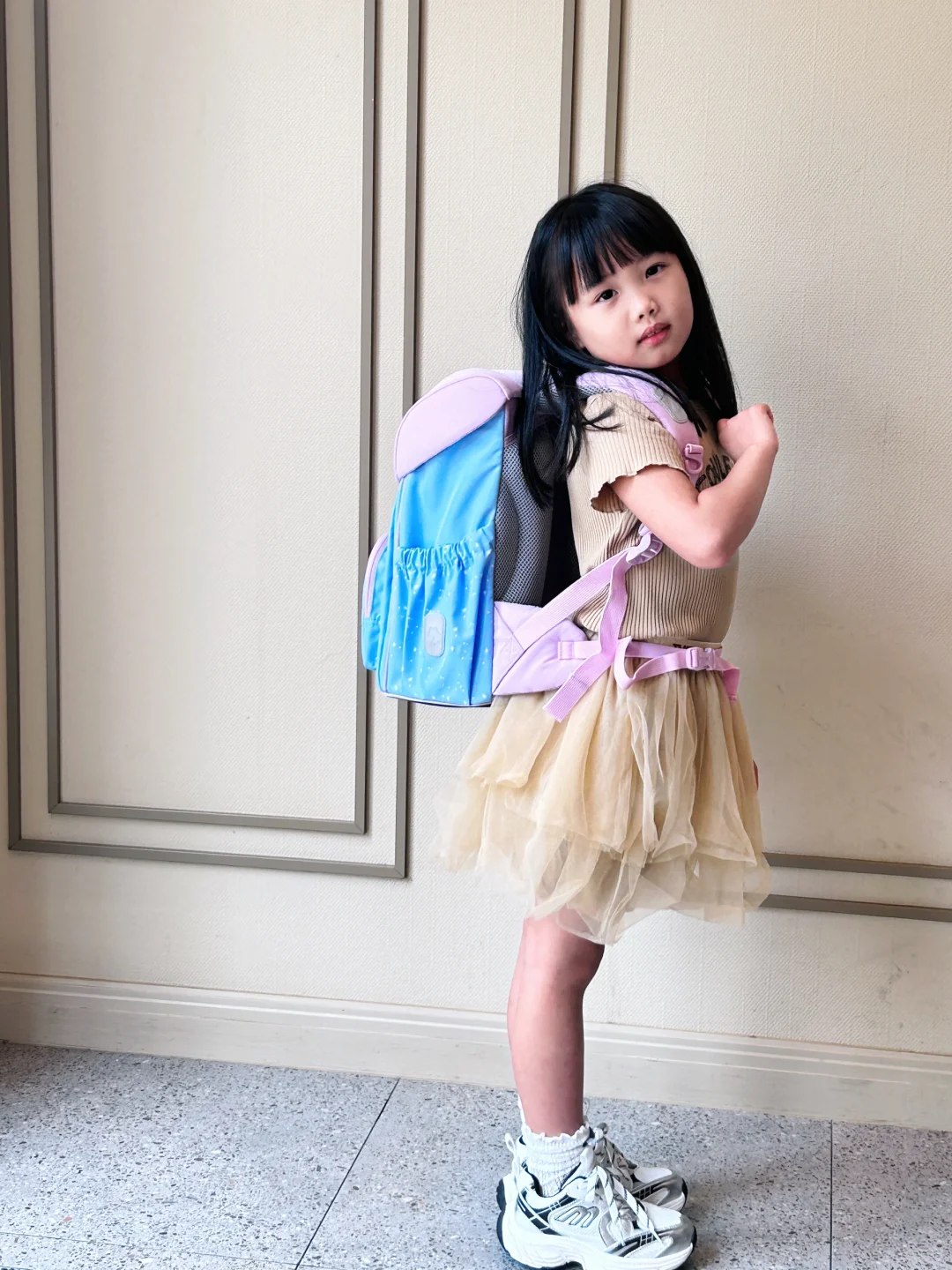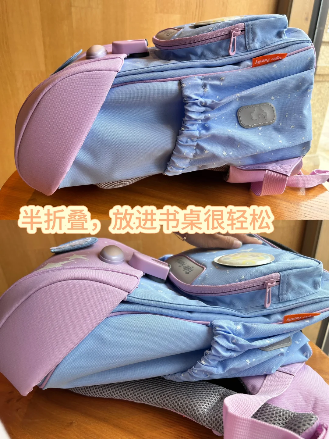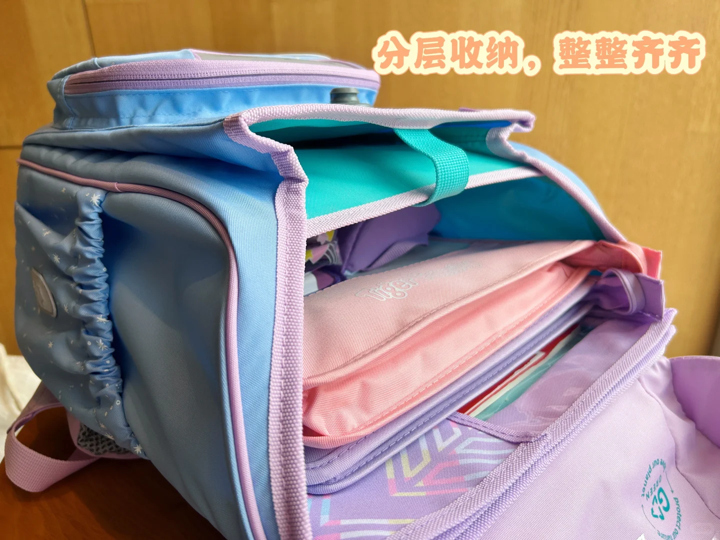 尤其书包还是可以自己立住的,不像市面上大多数书包整理的时候还要用手扶着,开关设计也是方便孩子操作的磁扣开关,内部还有隔层和固定带可以把文件袋书本固定好,不会再书包里面晃来晃去,也显得书包内很整齐。