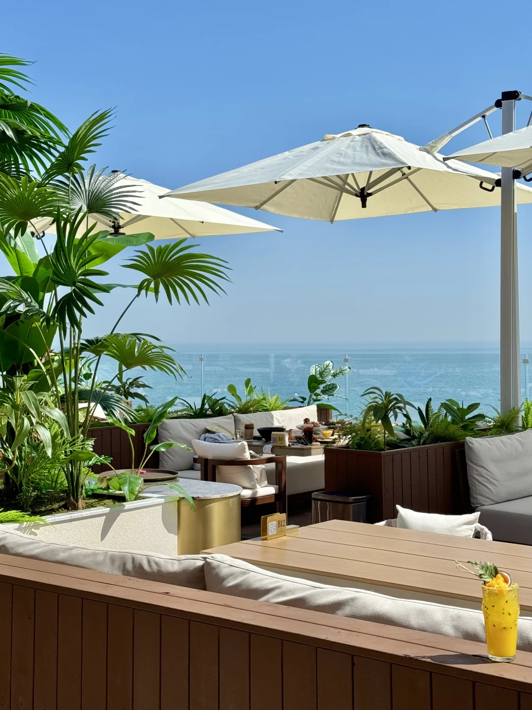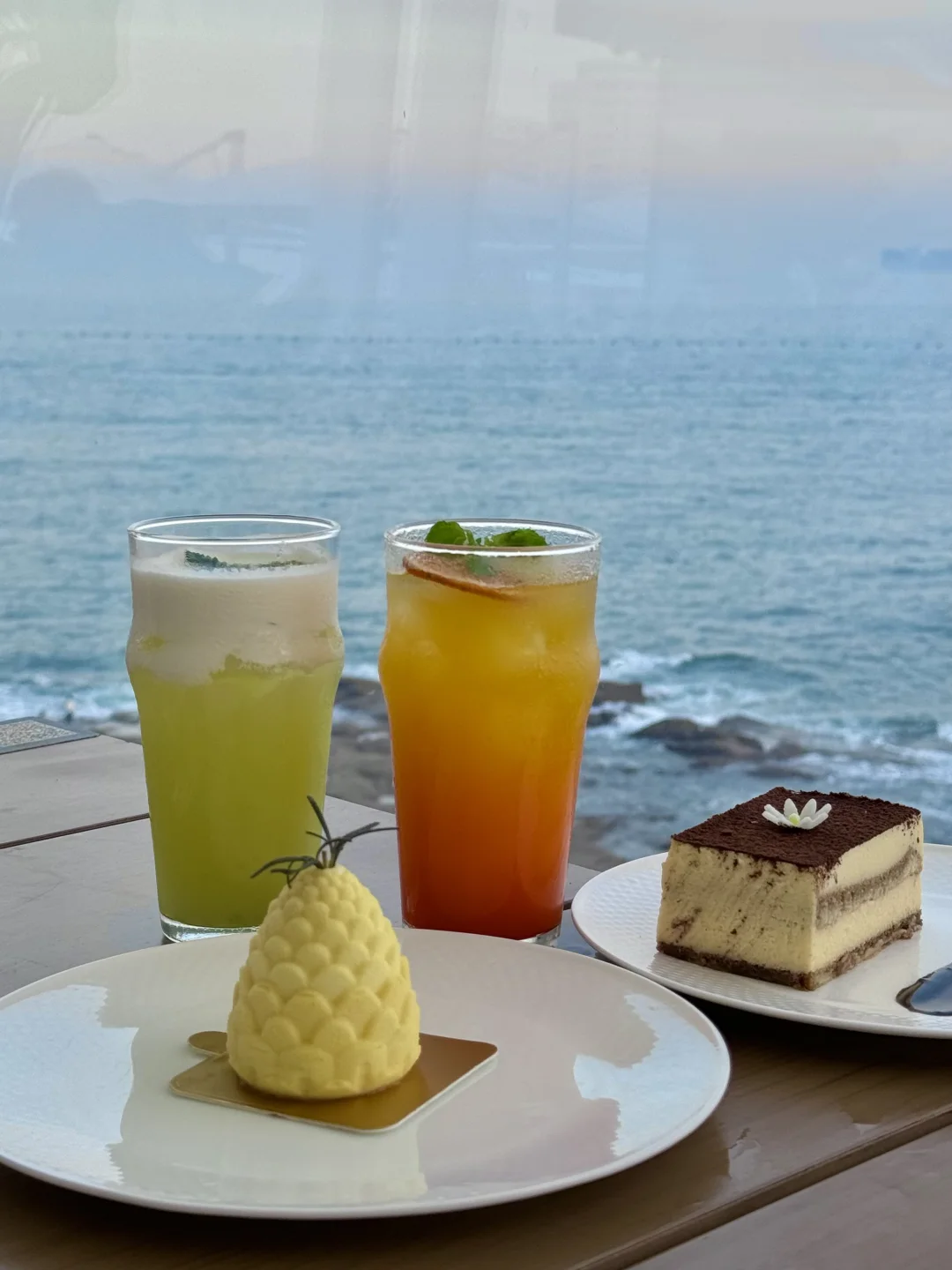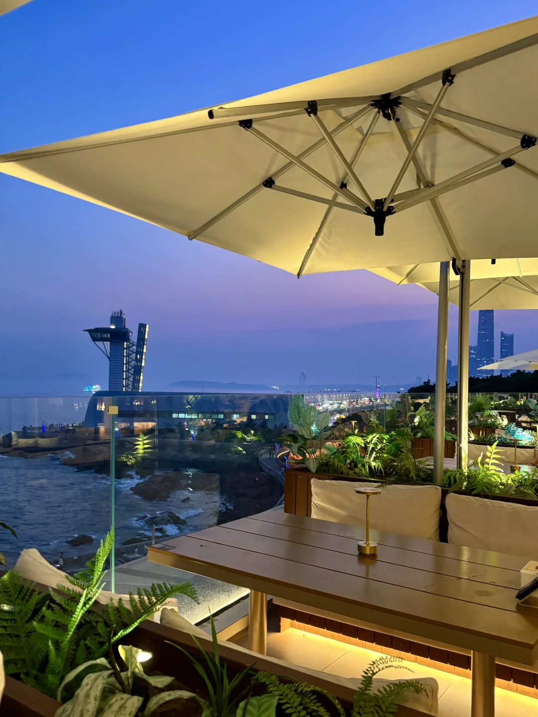 最近天气真的好好! 虽然天气预报显示下雨 但一会儿就晴了 打卡的这里是☕️咖啡厅也是餐厅🍴 270度海岸线 而且下楼就是海边🌊 从这儿去奥帆步行5分钟就到了 傍晚看完晚霞还可以看灯光秀 -