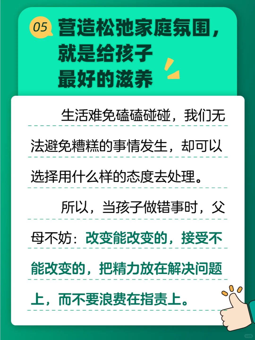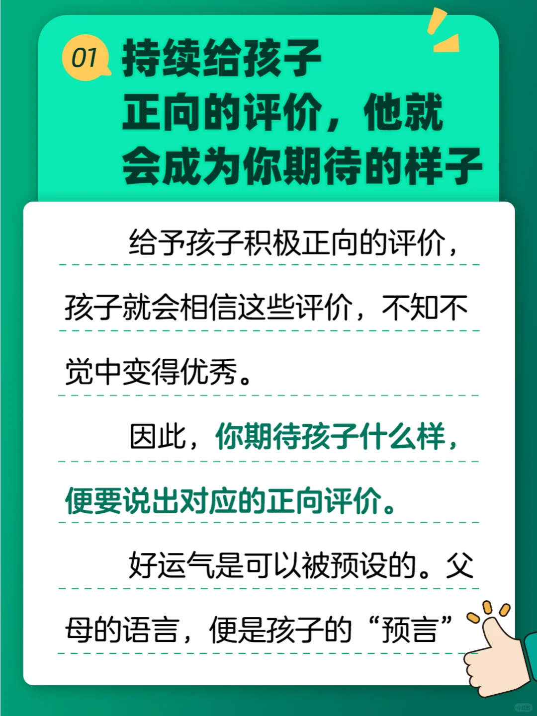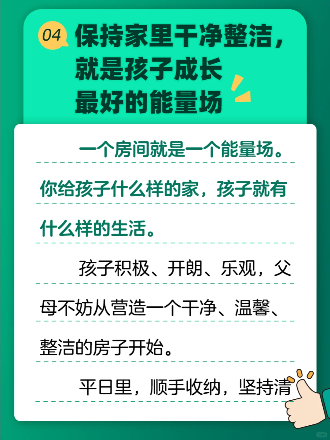 1️⃣持续给孩子正向的评价,他就会成为你期待的样子👍 2️⃣鼓励孩子敢想敢要,他就会值得世界的一切美好🌍 3️⃣让孩子坚持运动,就是在帮他积攒好运气🏃♂️ 4️⃣保持家里干净整洁,就是孩子成长最好的能量场🏡 5⃣营造松弛的家庭氛围,就是给孩子最好的滋养🏠💕