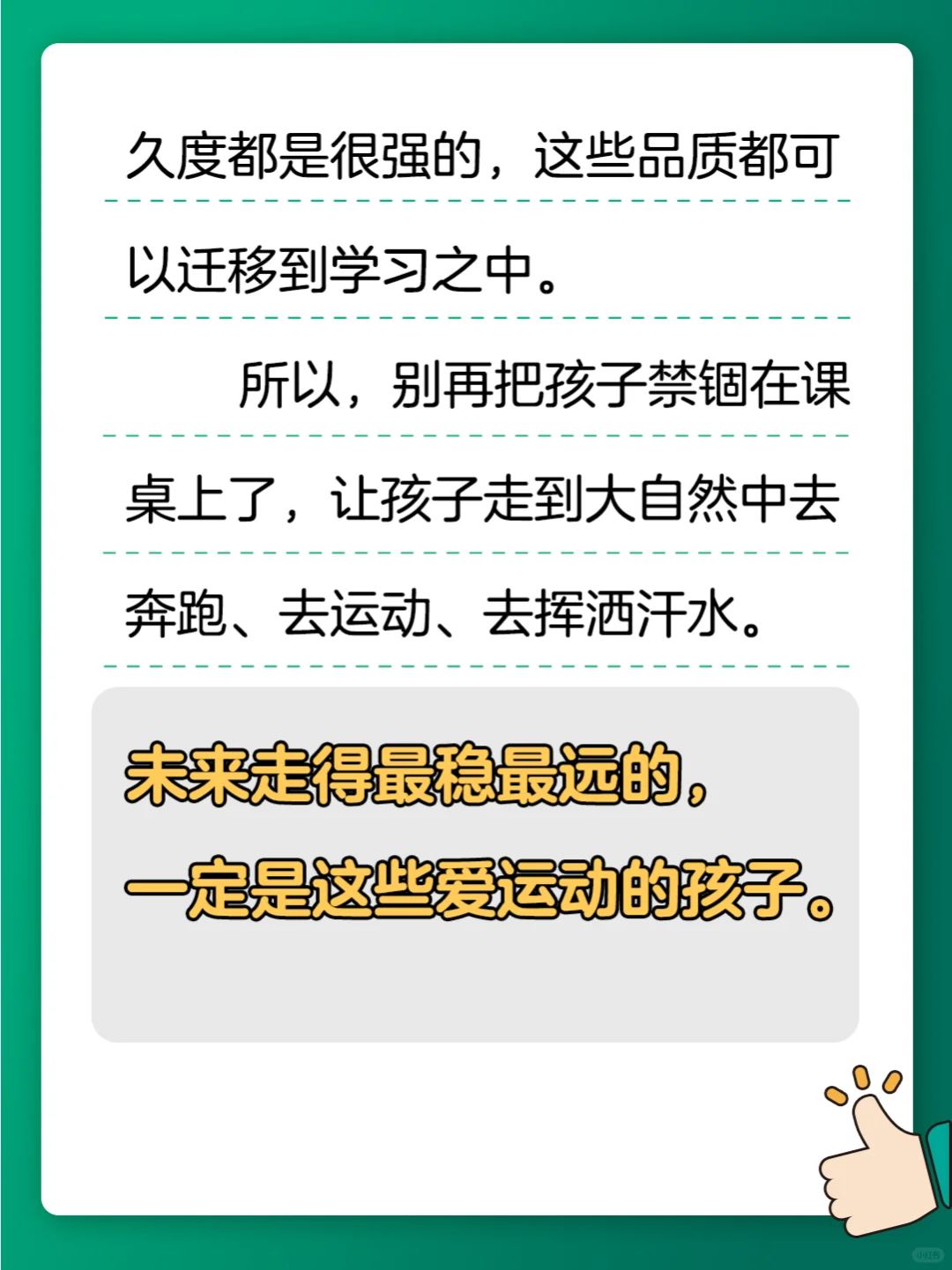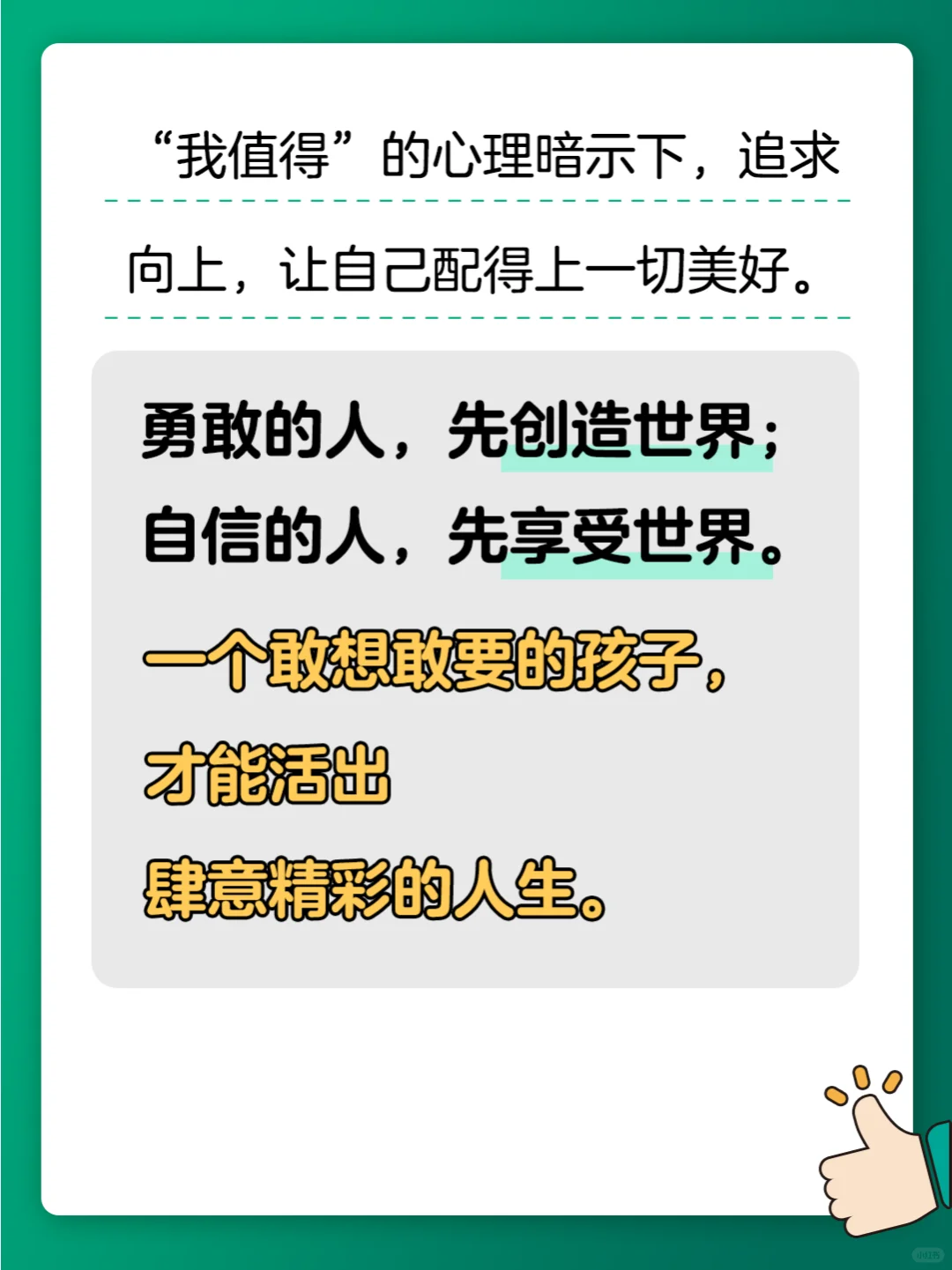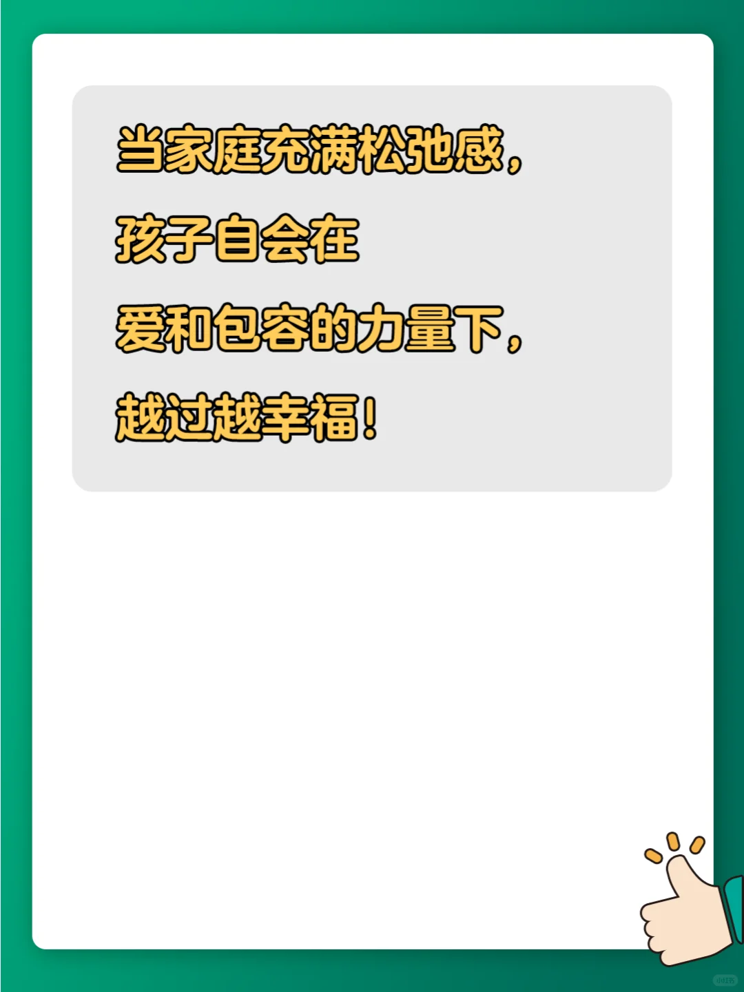 1️⃣持续给孩子正向的评价,他就会成为你期待的样子👍 2️⃣鼓励孩子敢想敢要,他就会值得世界的一切美好🌍 3️⃣让孩子坚持运动,就是在帮他积攒好运气🏃♂️ 4️⃣保持家里干净整洁,就是孩子成长最好的能量场🏡 5⃣营造松弛的家庭氛围,就是给孩子最好的滋养🏠💕
