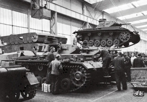 图3:德国军工厂的工人正在组装三号坦克摄于1940年5月。按照古德里安的构想,每个装甲师至少要装备180辆三号坦克和60辆四号坦克,波兰战役中三、四号坦克的优异表现,也让德军意识到其重要作用,加快了生产和装备的步伐