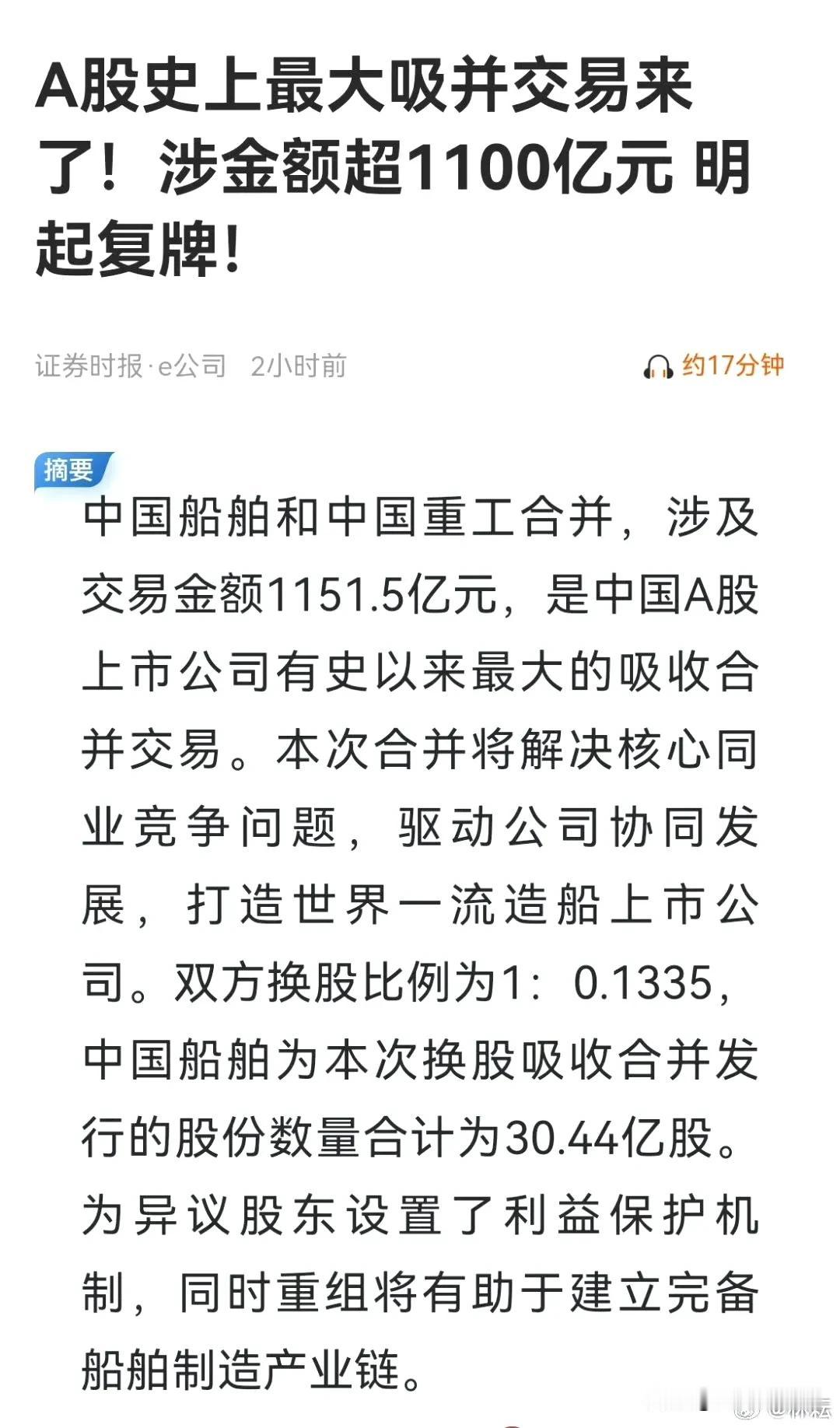 #a股# 中国船舶合并中国重工,号称A股史上最大规模并购案,但从今天它们复牌表现来看,队伍不好带了,这类吸收合并很难获得追捧。