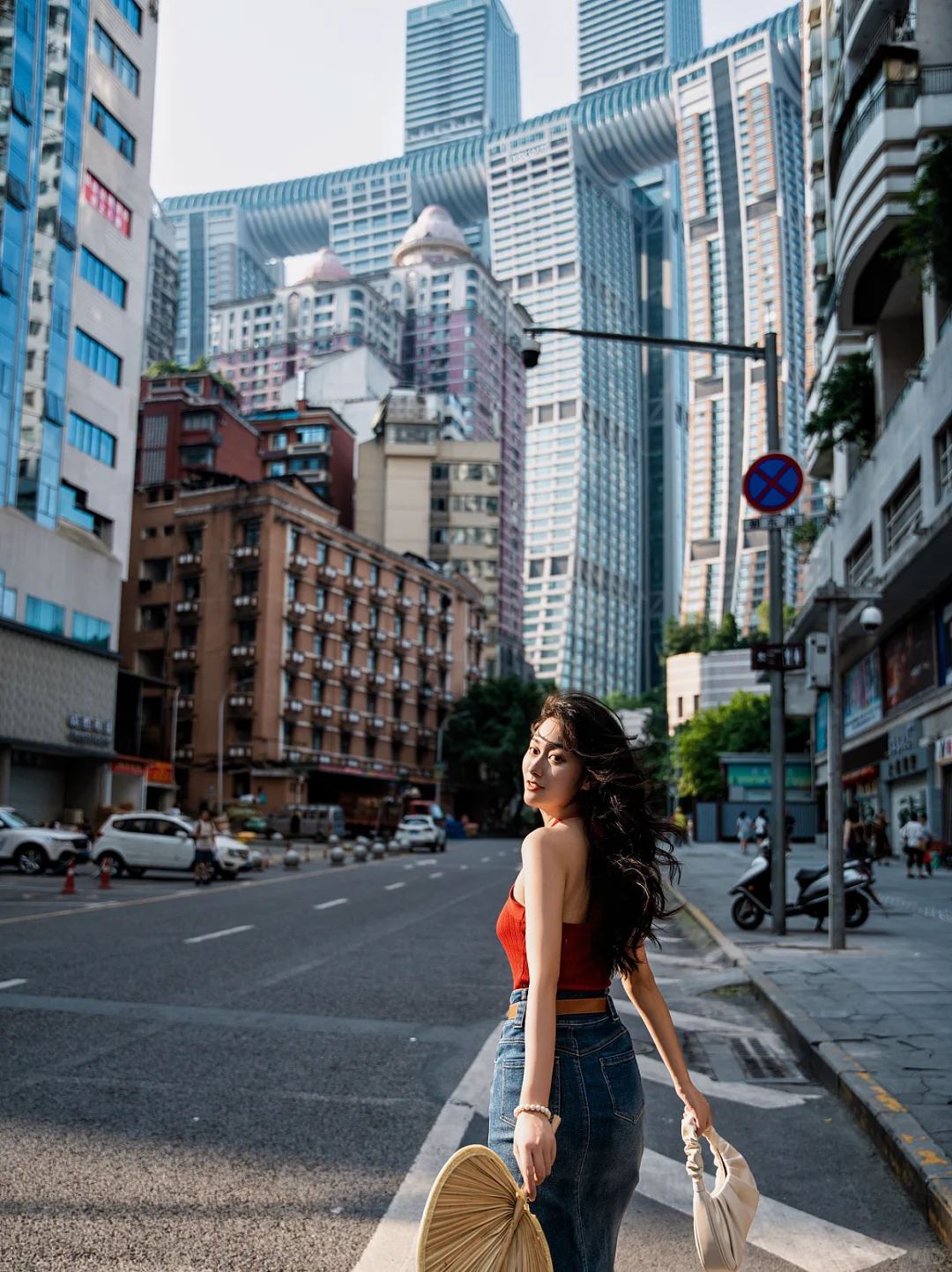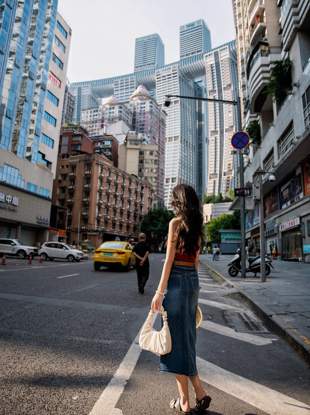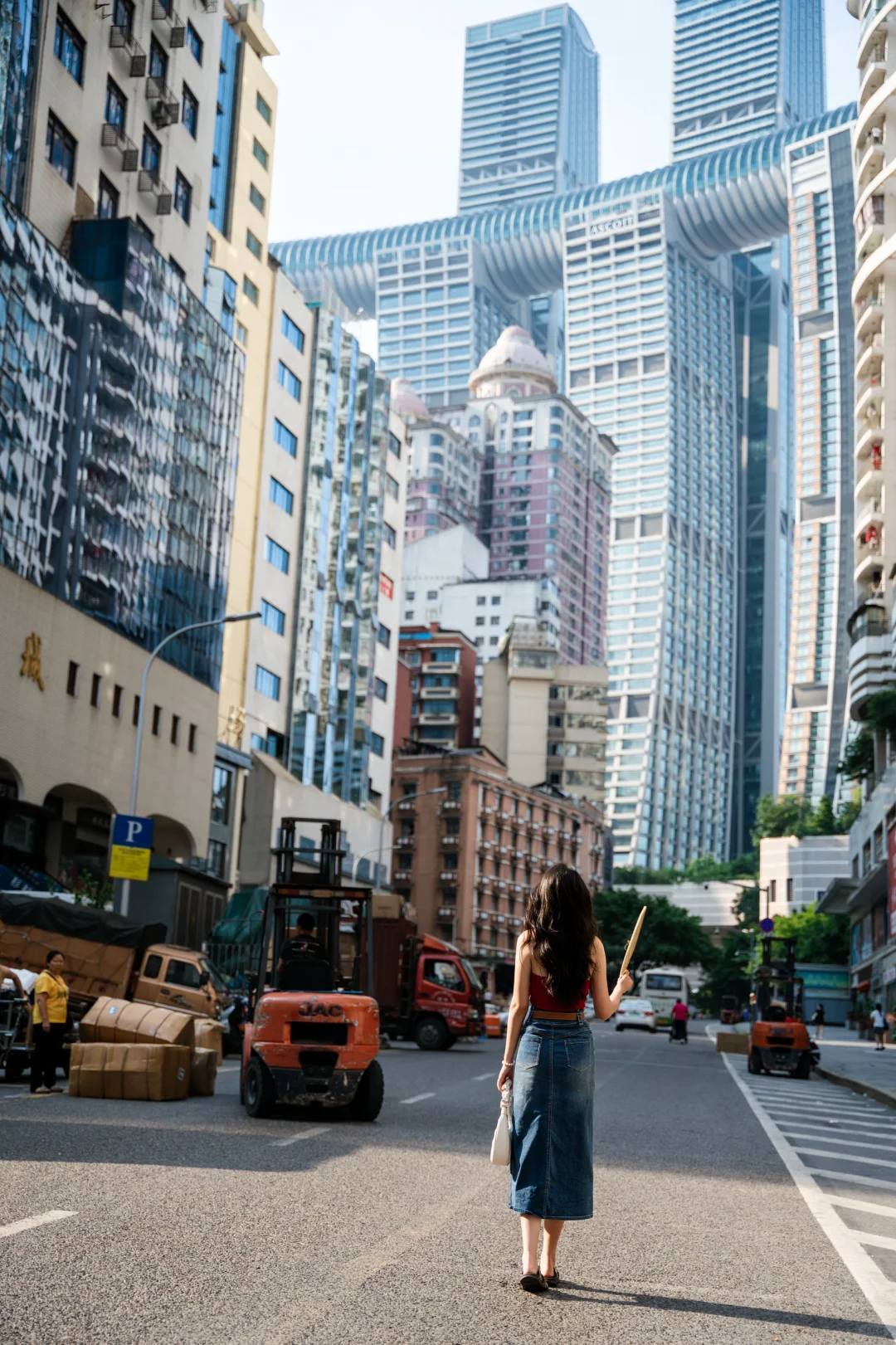 🔹这条街还保留着许多老山城的样态,路两边是p发市场,还有许多棒棒搬运师傅,也很适合拍人文扫街透过马路就能看到重庆市的地标建筑——来福士高楼,仿佛进入8D魔幻世界。