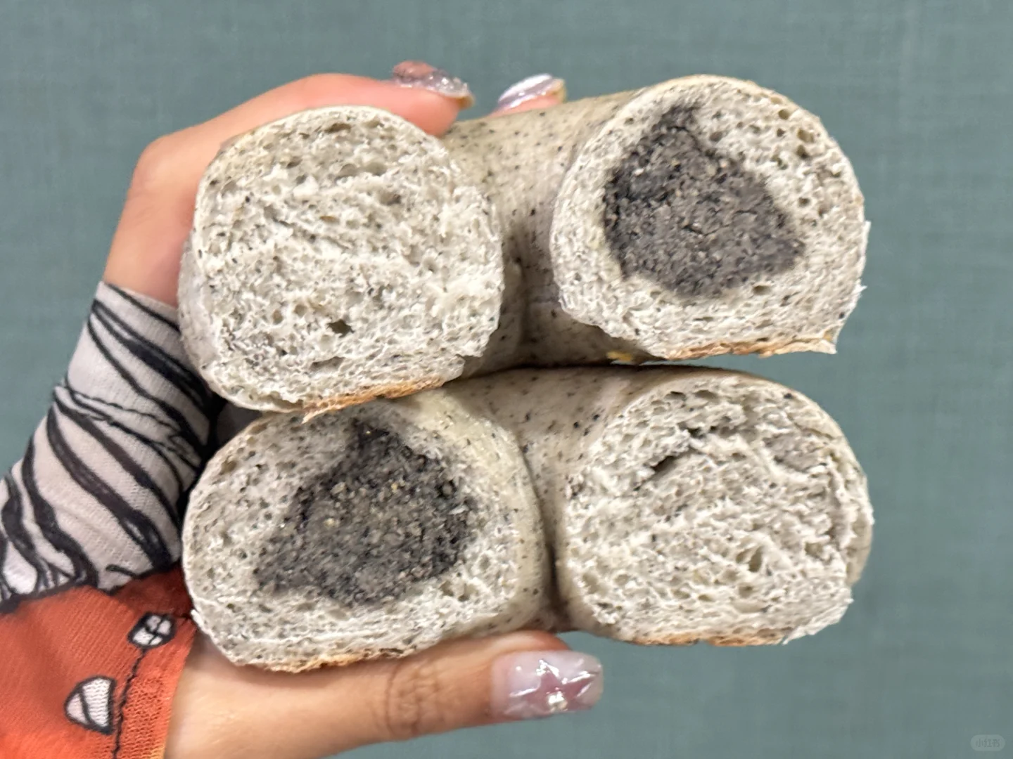 黑芝麻贝果,黑芝麻馅很多,但是一点甜味都没有,贝果体是我喜欢的韧贝