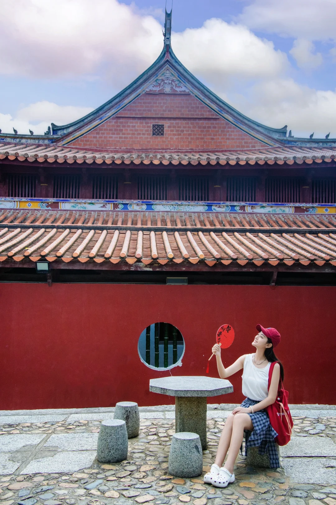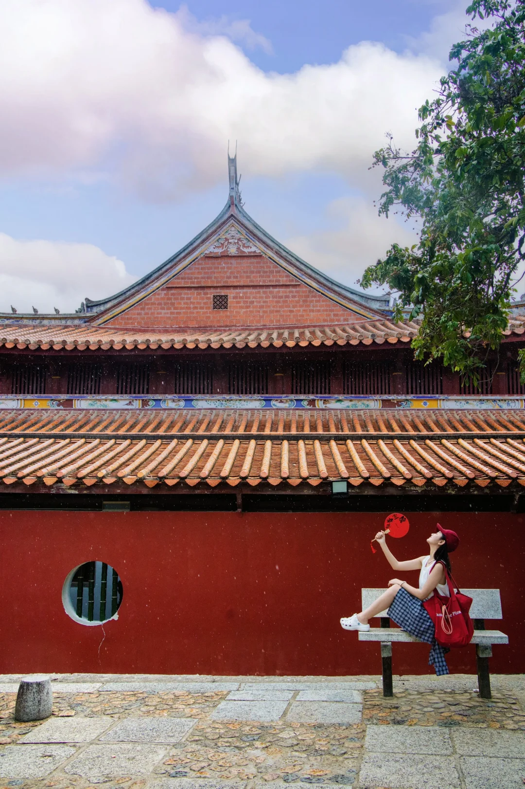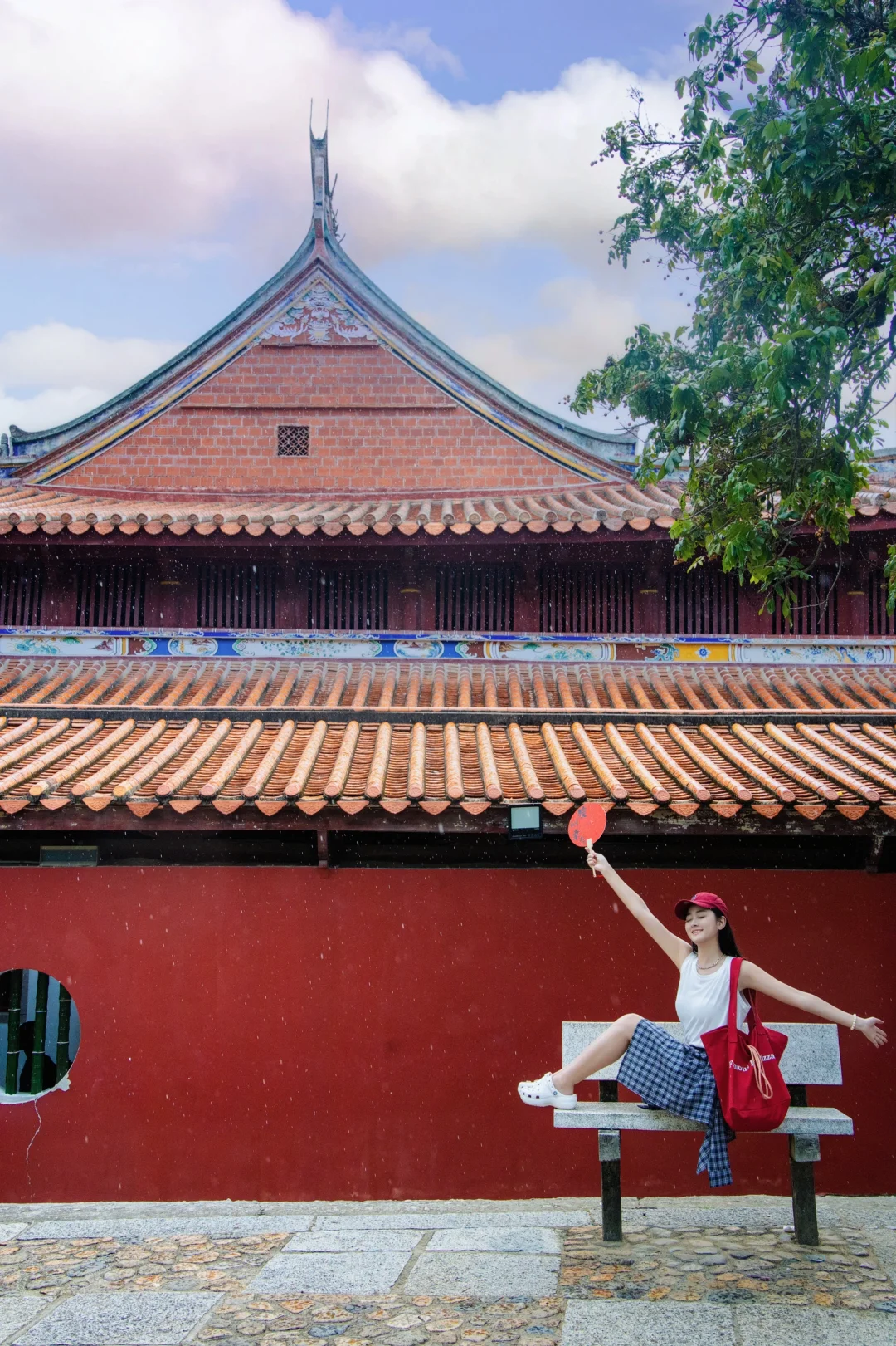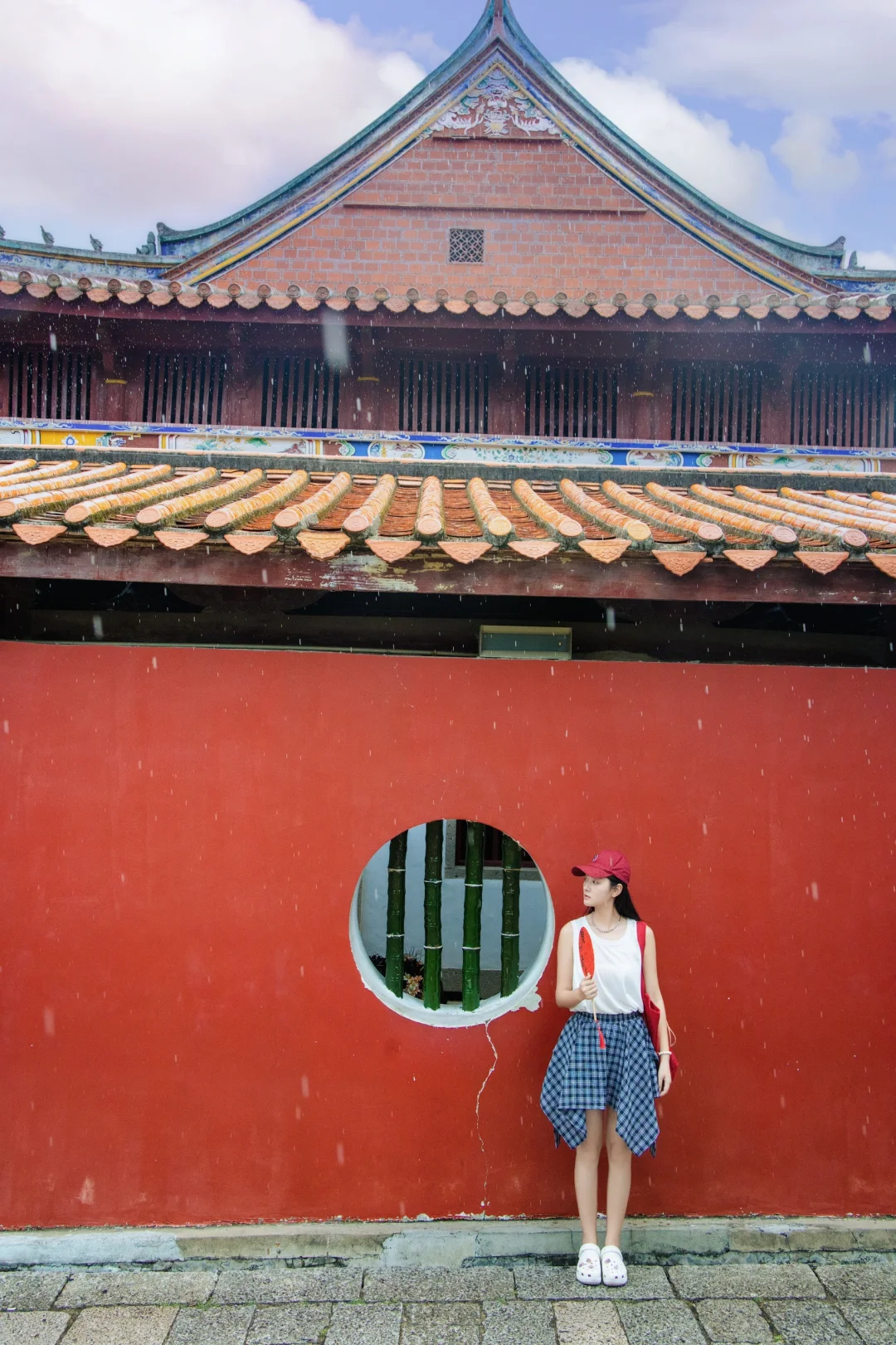 红墙长廊上下拍照都有不同的感觉,如果人少,右侧的长椅 和 中间的石桌都可以坐着咔咔咔来几张,怎么拍都好看,我拍照的时候刚好下起小雨🌧️,居然有种❄️落的感觉