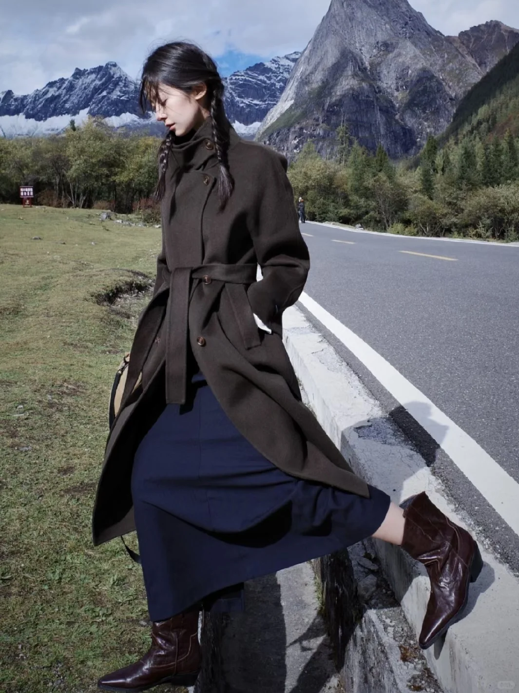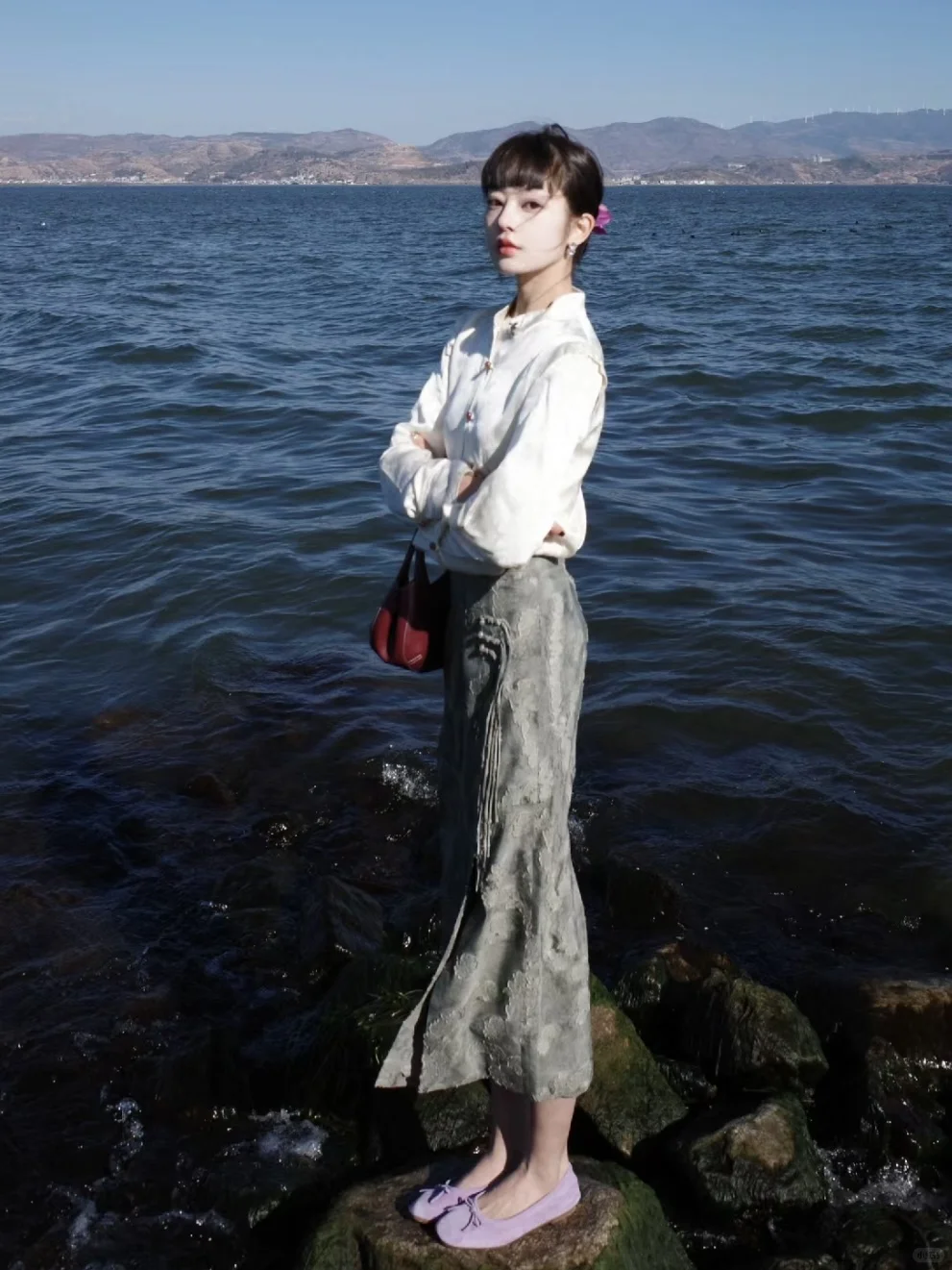 姐姐在溪边美得像幅自然画卷!黑色紧身衣勾勒出曼妙曲线,米色裤装衬得身姿挺拔,低丸