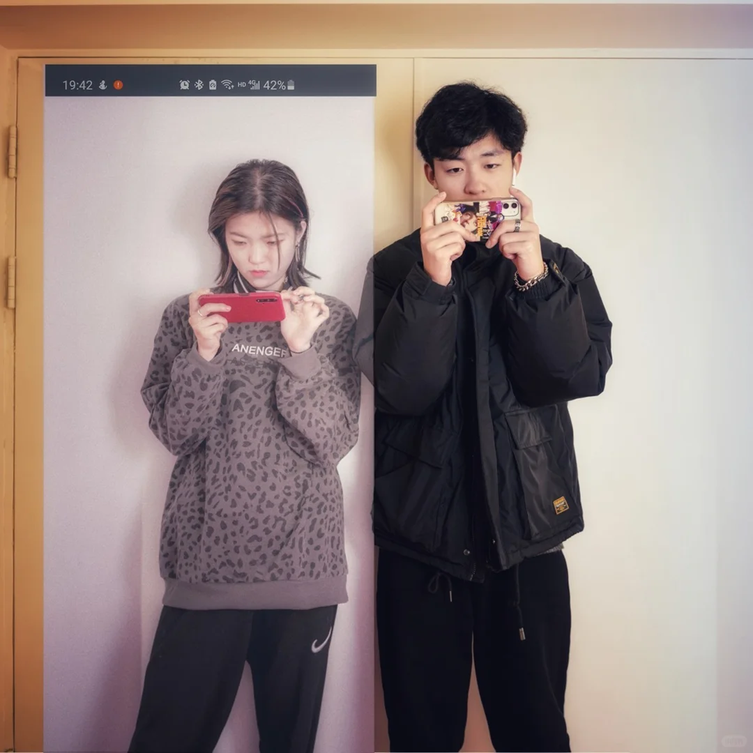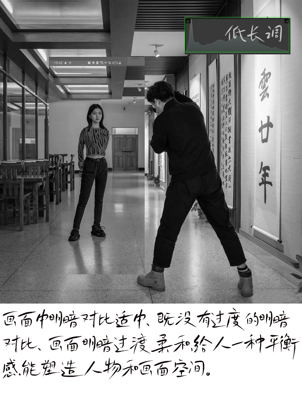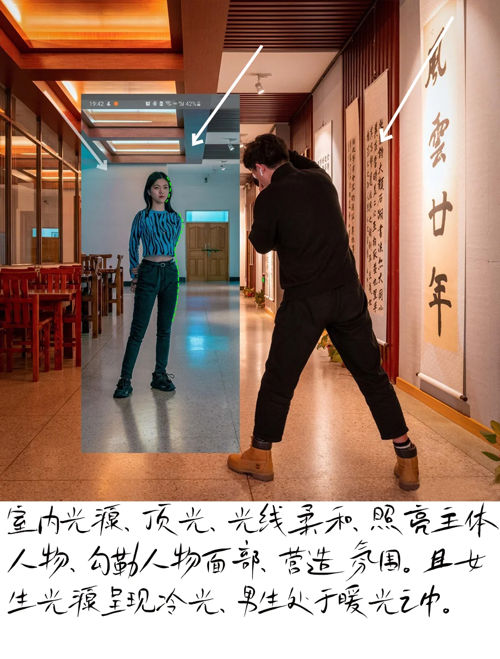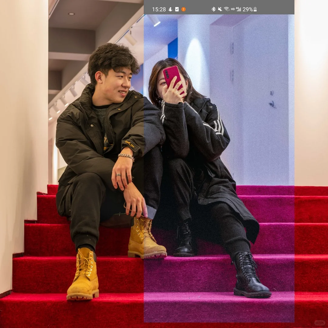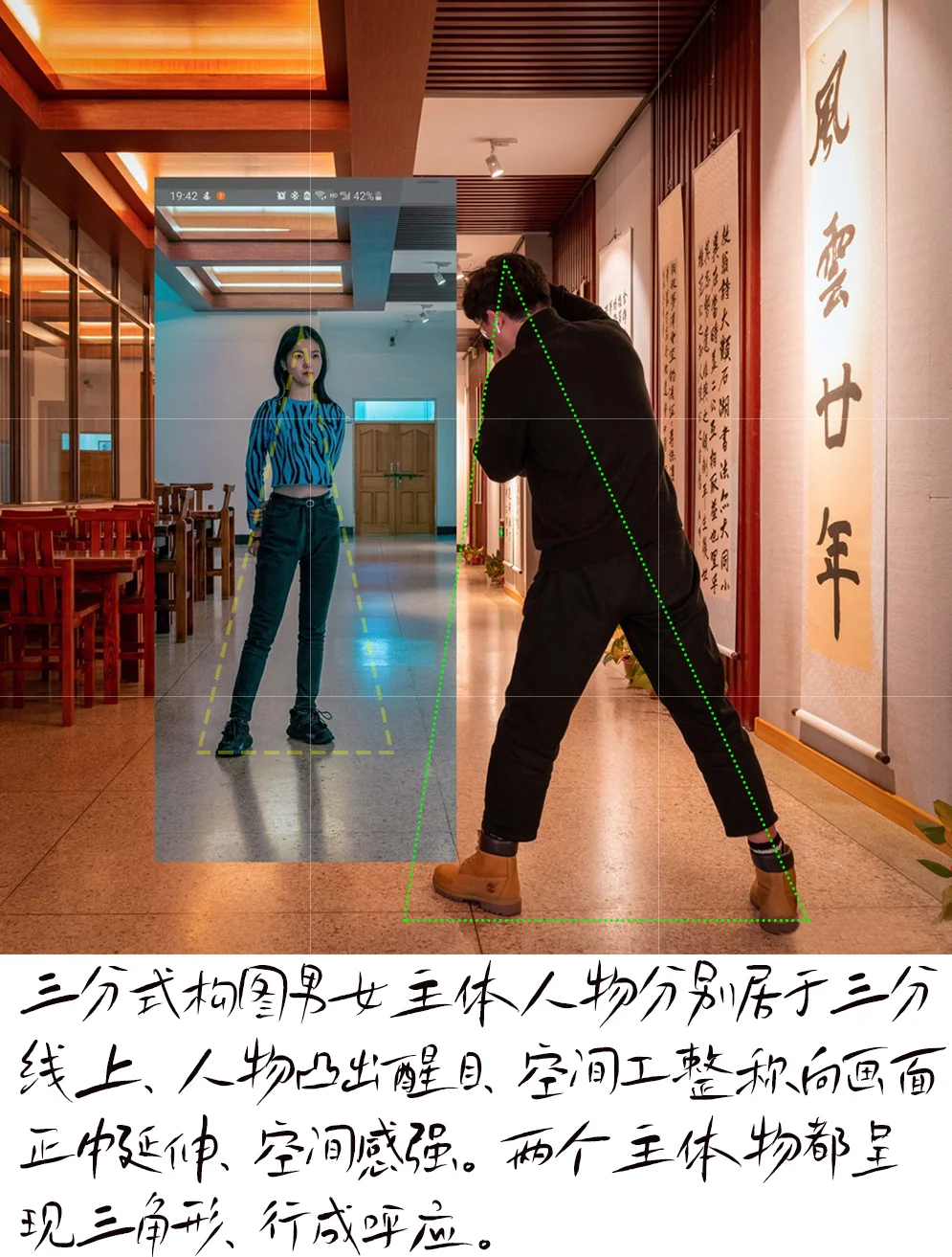 5.主体画面用,中景拍摄,50-80㎜镜头,小光圈拍摄。女生是用手机拍摄,焦段50-80。两张图通过前后两张照片拼合而成。