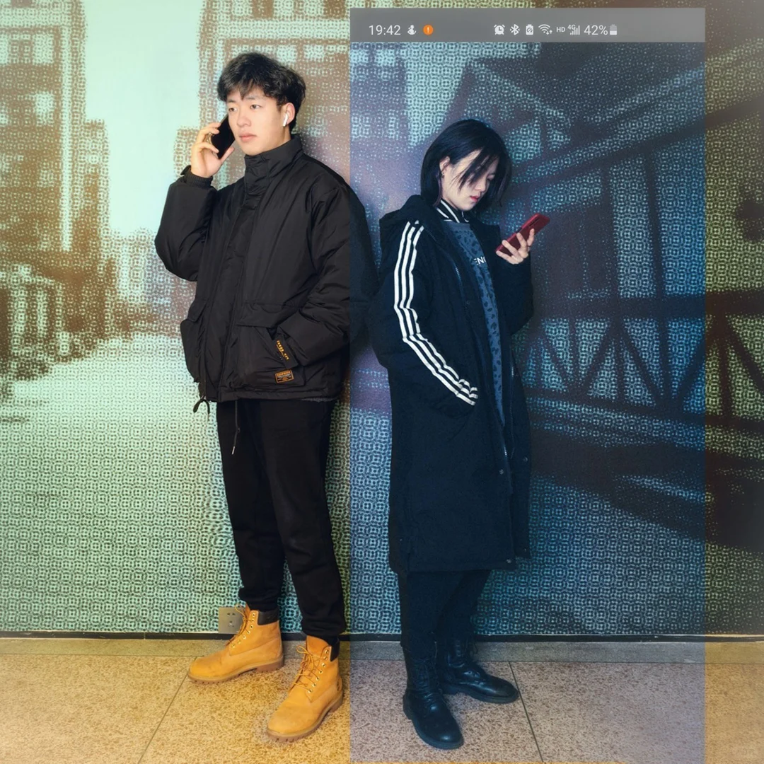 4.颜色:冷暖色对比,画面男生呈暖黄色,呈现温暖感。女生处于冷色调中,营造出客观,冷静的现实感。能很好的凸出画面主体,传递冲突感。