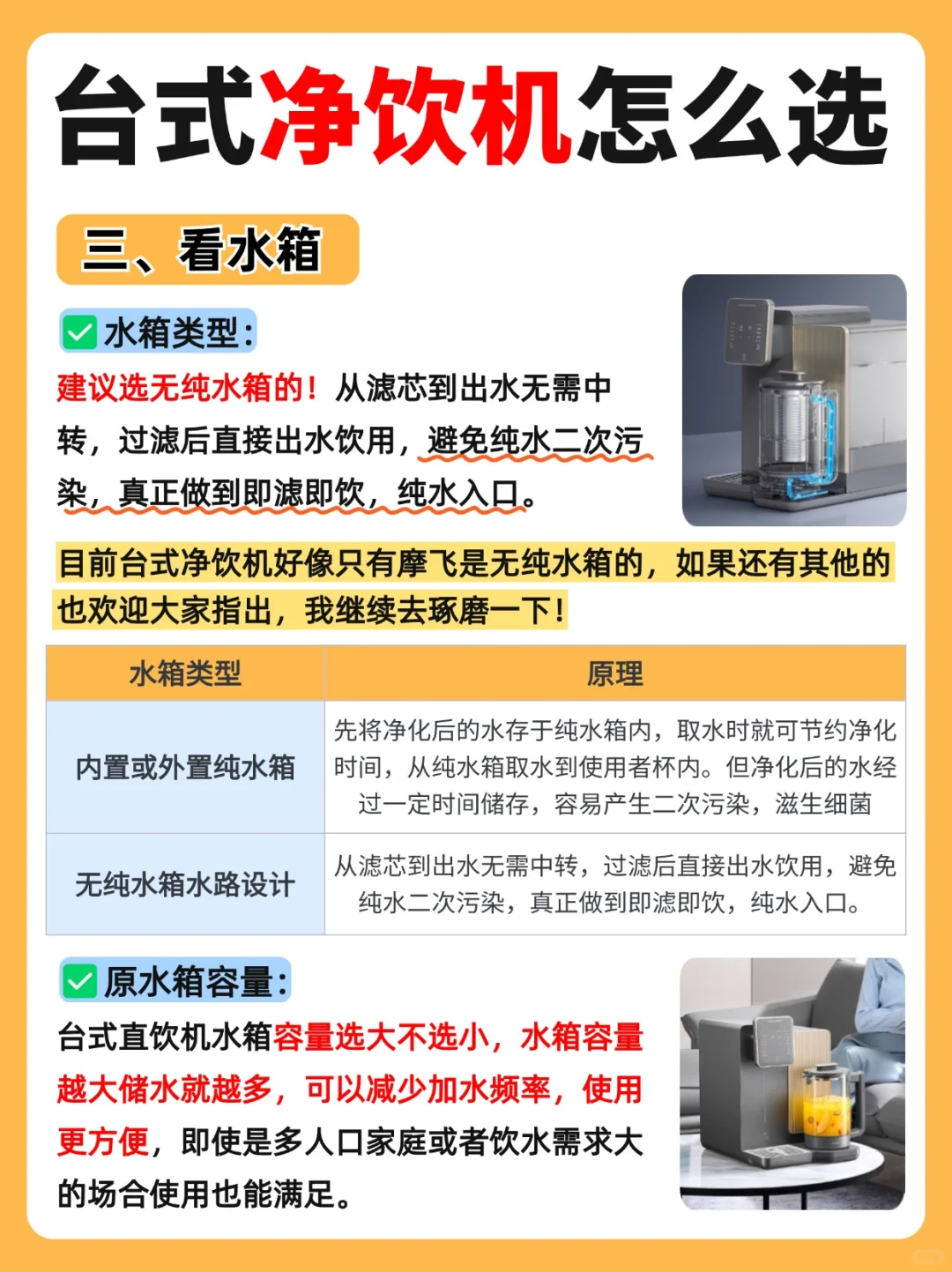 建议选无纯水箱的!出水无需中转,即滤即饮!避免纯水二次污染。目前台式净饮机只有摩飞是无纯水箱的,如果还有其他的也欢迎大家指出,我继续去琢磨一下!