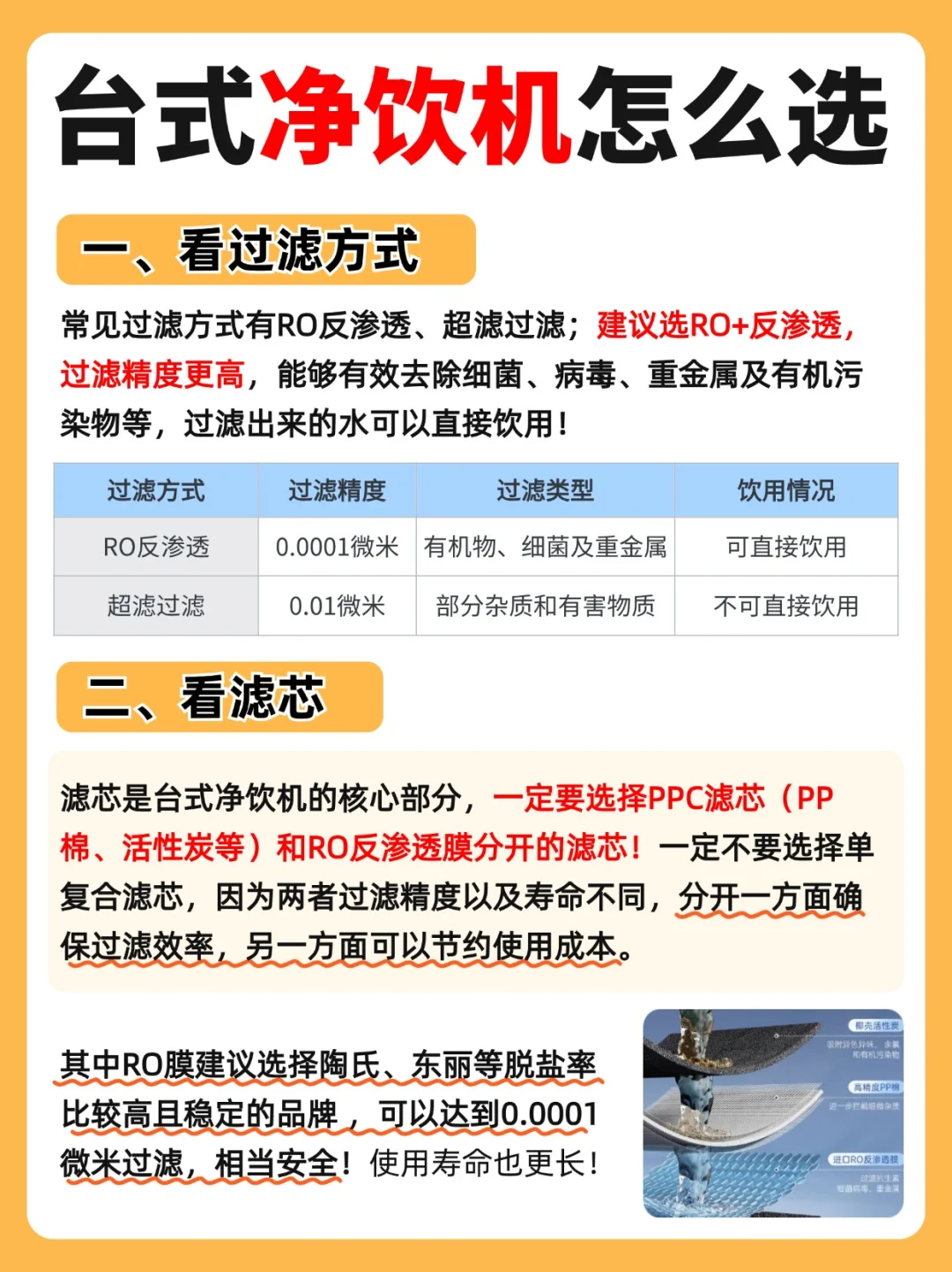 一定要选择PPC滤芯(PP棉、活性炭等)和RO反渗透膜分开的滤芯!一方面确保过滤效率,另一方面可以节约使用成本。