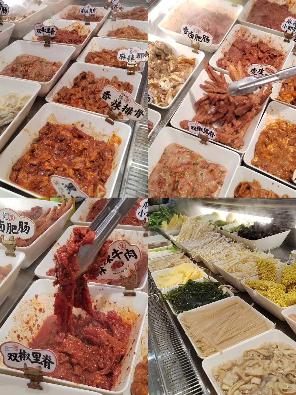 菜品种类也很多,有几十种荤素,特别是它家的麻辣牛肉,毛肚,虎皮鸡爪,再搭配上各种蔬菜,一起炫饭简直太巴适了!