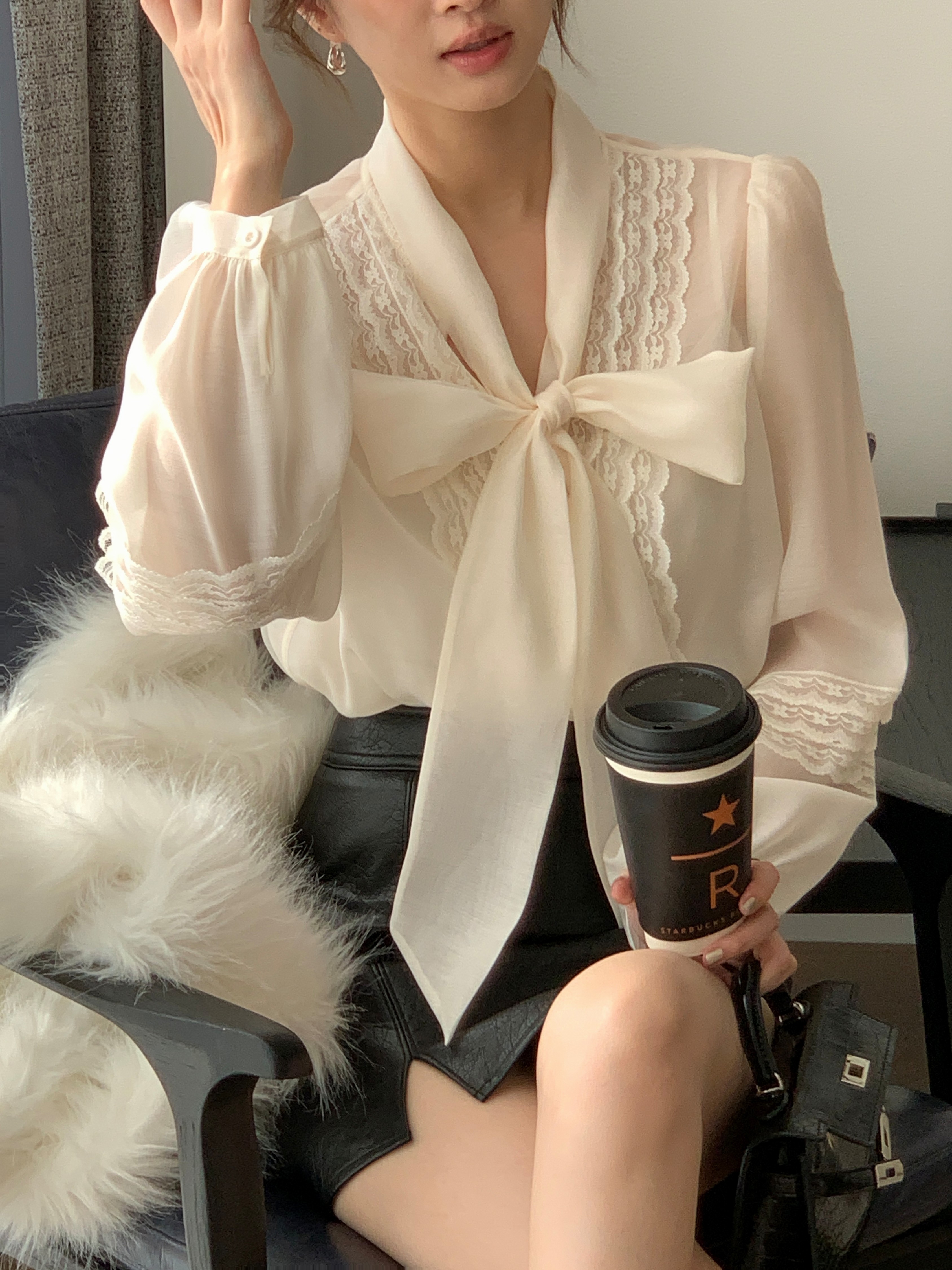 优雅法式风情,白色系带蝴蝶结设计,展现女性柔美气质。长袖衬衫,秋季必备,尽显高雅品味。