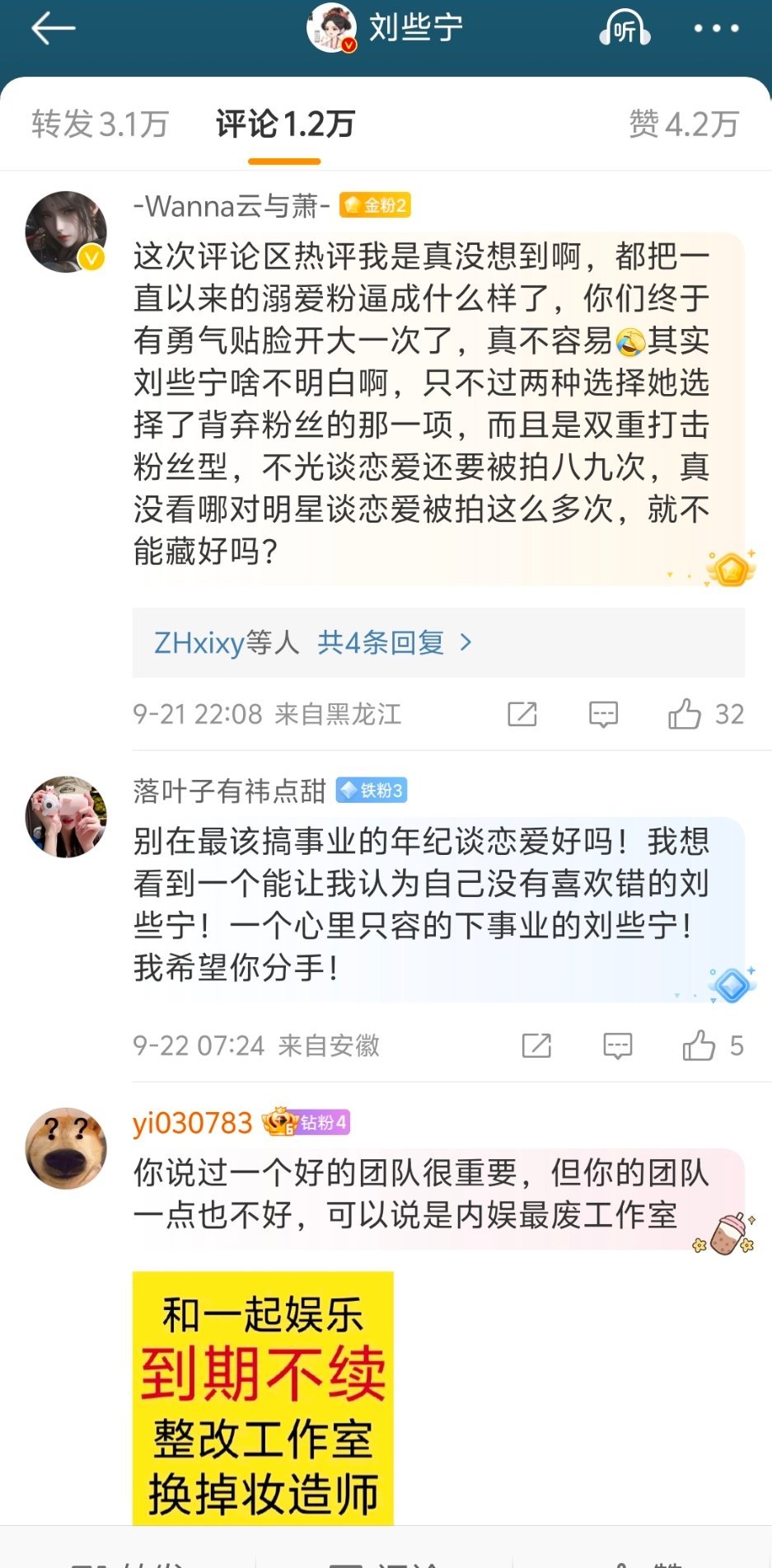 刘些宁的评论区都是粉丝在劝分手