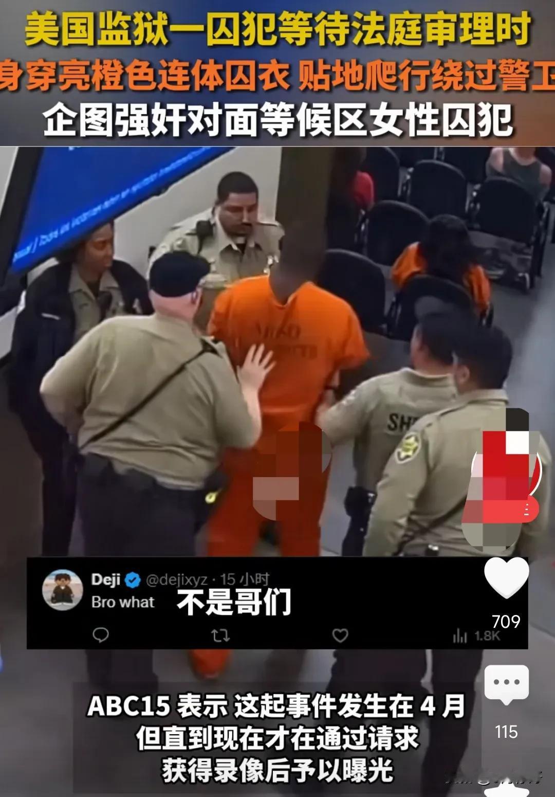 这也太离谱了吧,堪称活久见系列,电视剧也不敢这么编啊。 9月21日报道美国亚利桑那州,4月份的时候,美国一囚犯准备受审,这囚犯没被戴脚链和手铐,失误太大了,他在地上贴地爬行,企图绕过警卫,他这么做竟然是想强奸一个女囚。 这未免也太色胆包天了吧,这是完全活在自己的世界,把周围人当空气了吗? 他的行为被一名女子发现了,女子尖叫,然后其他人控制了这名男子。 估计又得增加一条强奸未遂的罪名了,这真是何苦呢? #美国一囚犯绕过警卫企图强奸女囚#