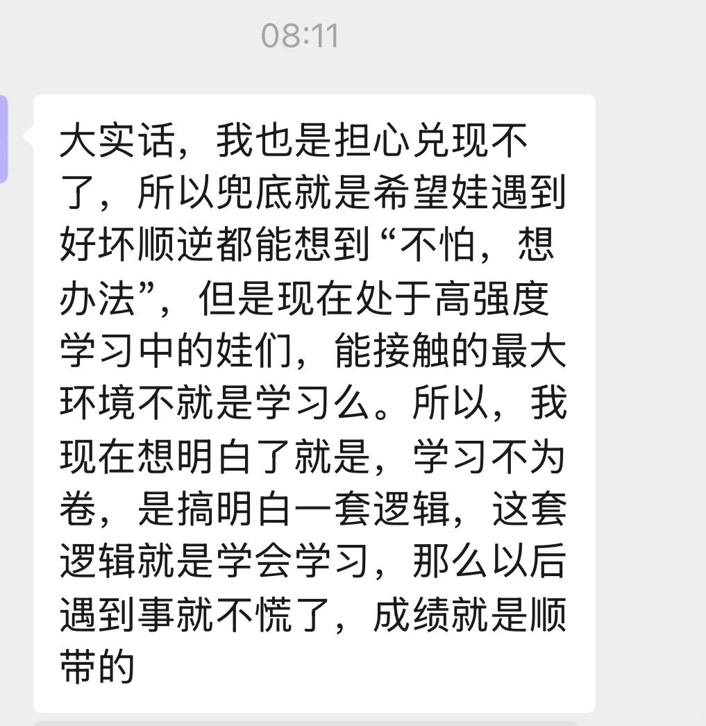 👩🦰:大实话,我也是担心兑现不了,所以兜底就是希望娃遇到好坏顺逆都能想到“不怕,想办法”,但是现在处于高强度学习中的娃们,能接触的最大环境不就是学习么。所以,我现在想明白了就是,学习不为卷,是搞明白一套逻辑,这套逻辑就是学会学习,那么以后遇到事就不慌了,成绩就是顺带的。