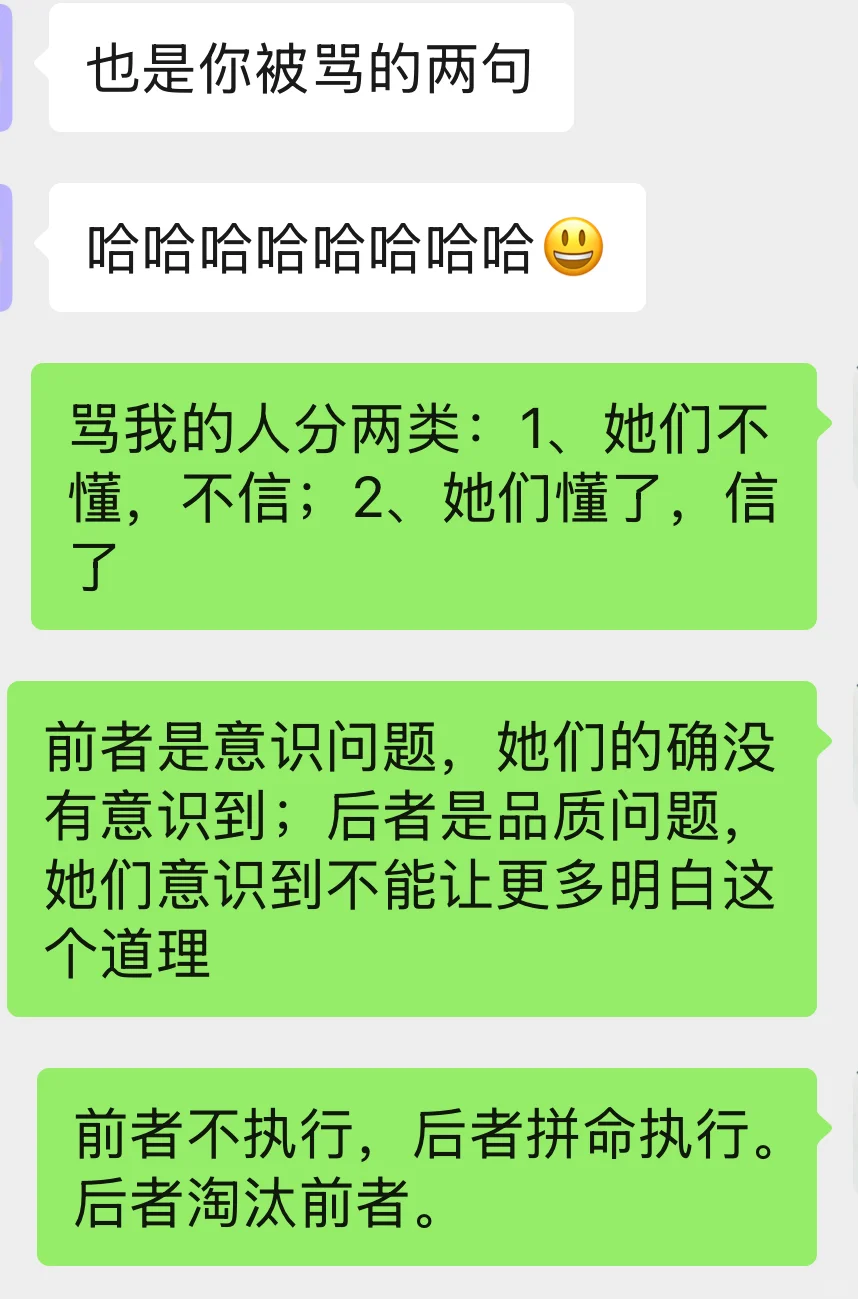 🥷:骂我的人分两类:1、她们不懂,不信;2、她们懂了,信了。前者是意识问题,她们的确没有意识到;后者是品质问题,她们意识到不能让更多人明白这个道理。前者不执行,后者拼命执行。后者淘汰前者。