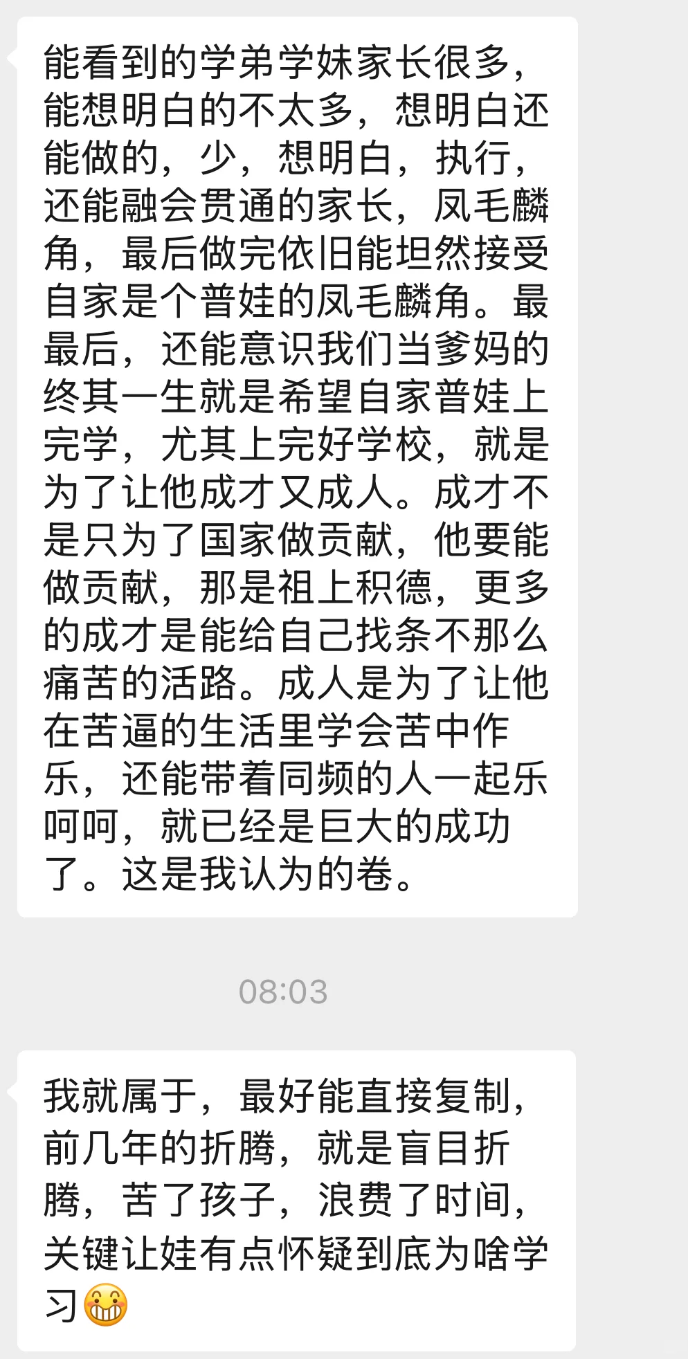 👩🦰:能看到的学弟学妹家长很多,能想明白的不太多,想明白还能做的,少,想明白,执行,还能融会贯通的家长,凤毛麟角,最后做完依旧能坦然接受自家是个普娃的更是凤毛麟角。最最后,还能意识我们当爹妈的终其一生就是希望自家普娃上完学,尤其上完好学校,就是为了让他成才又成人。成才不是只为了国家做贡献,他要能做贡献,那是祖上积德,更多的成才是能给自己找条不那么痛苦的活路。成人是为了让他在苦逼的生活里学会苦中作乐,还能带着同频的人一起乐呵呵,就已经是巨大的成功了。这是我认为的卷。