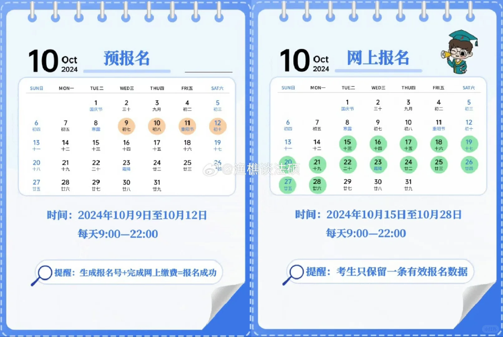 今年的预报名推迟到10月9日~12日啦 (听说是因为新增了不少硕士点,所以很多学校招生简章还在审核) 往年9月10号开始很多学校都出正式招生简章,今年估计就是因为预报名推迟,招生简章也都不着急出啦 但是考试时间还是12月21、22、23,不能松懈呀!