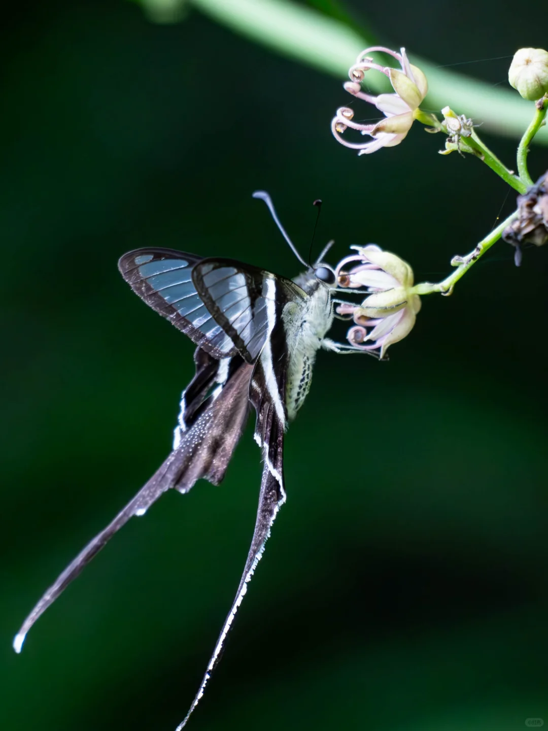 但燕凤蝶的魅力,可不仅限于它的体型。它拥有两条飘逸的长尾,宛如燕子的尾巴,优雅地在空中划过。这独特的尾突,不仅赋予了它燕子般的飞行技巧,还能在空中悬停、倒飞,甚至快速变换方向。它们在空中的每一次舞动,都像是在演绎一场无声的芭蕾,优雅而神秘。