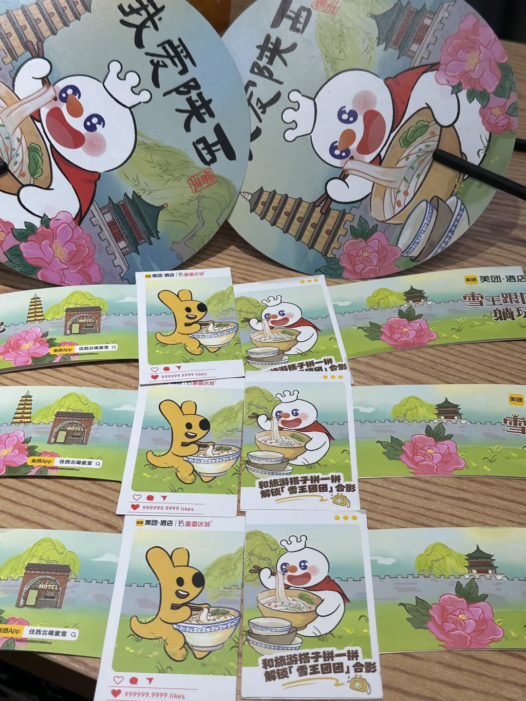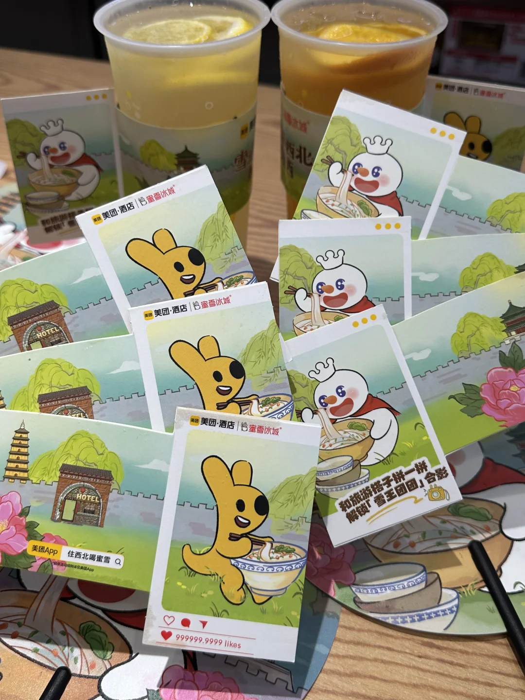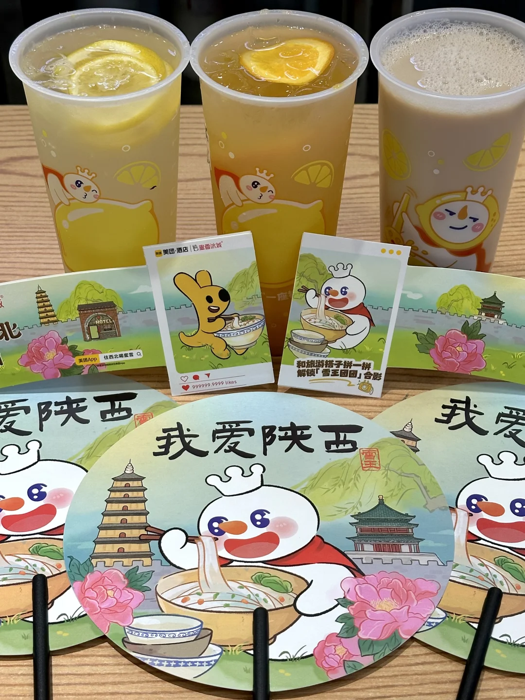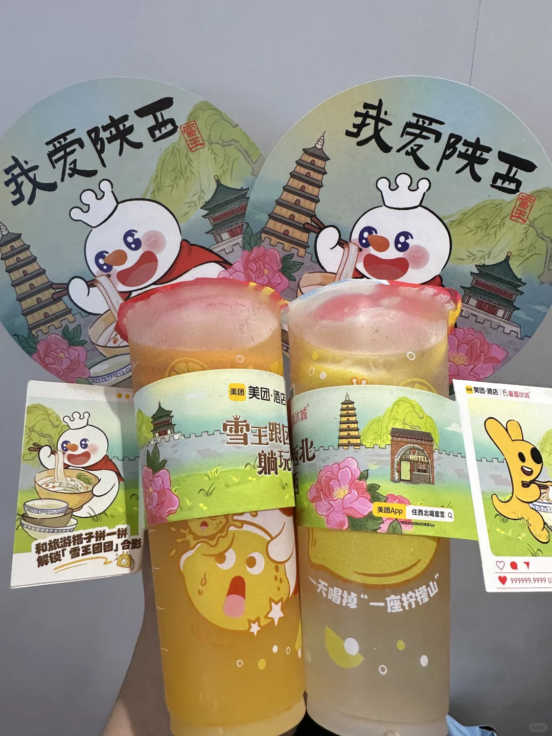 雪王✖️美团酒店联名 跟着一起游西北 蜜雪这次活动真的太给力了 购满12元抽可以10000元美团旅行金 还可以获得一把摇钱扇🪭(每店限量100把 +2个杯套 (仅甘肃、内蒙古、宁夏、 青海、山西、陕西、新疆地区 ✔️这次的周边摇钱扇真的好好看 拿去打卡钟楼、大雁塔都好出片 ✔️杯套正反两面不一样 两个合在一起就拼成雪王和美团的合照 点的棒打鲜橙和柠檬水 夏日真的清凉解暑