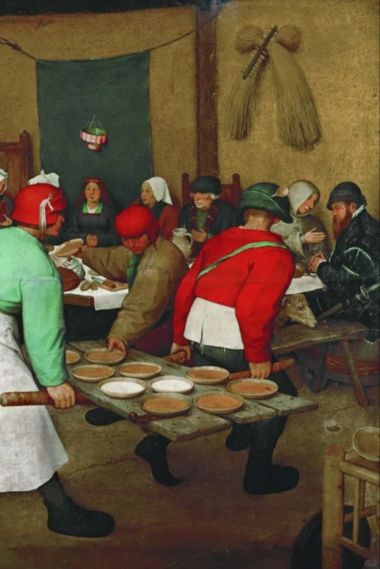 席上的人很多,但大都庸庸碌碌,或者心事重重,他们自顾吃喝,只有角落里的教士在聊着天。餐宴看上去还算丰盛,可仔细一瞧,那些盘子里都只有薄薄一层,不知是面饼还是米粥。尽管如此,人们仍吃得津津有味,坐在地上的小孩吮吸自己的手指,享受着这顿平日里难得遇到的“美味”。